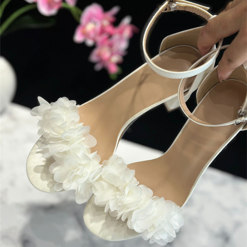 新款一字带露趾凉鞋女夏外穿仙女风花朵粗跟凉鞋白色婚礼鞋