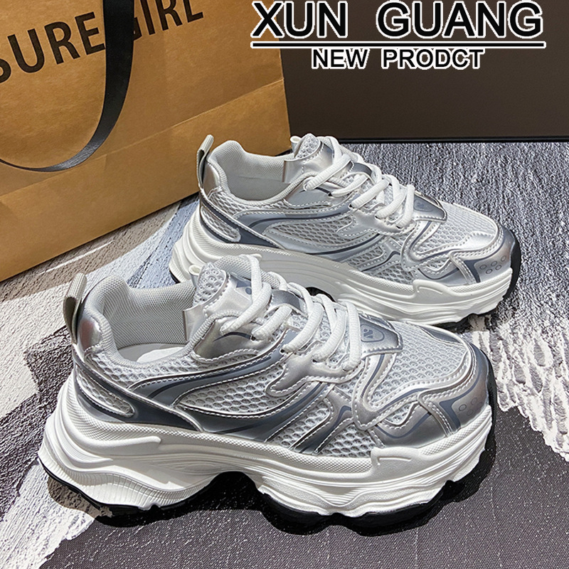 真皮厚底增高显脚小老爹鞋女夏季新款百搭网面透气运动休闲鞋