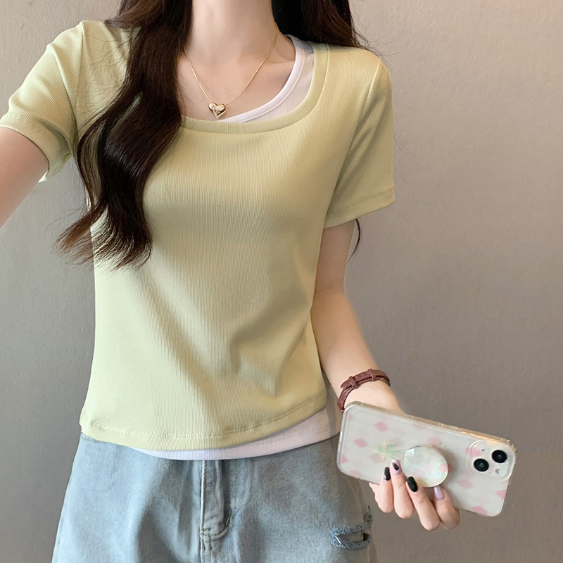 设计感正肩假两件撞色短袖t恤女夏季露锁骨方领显瘦短款辣妹上衣
