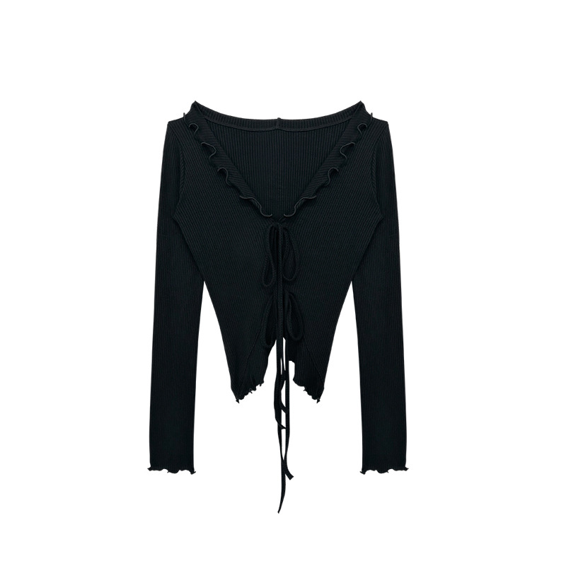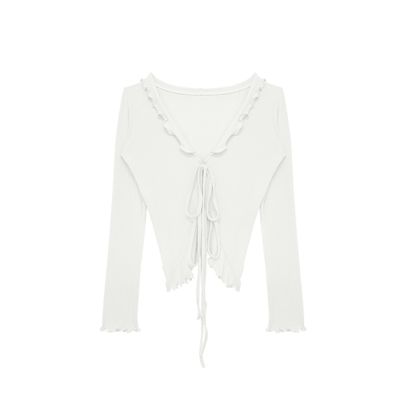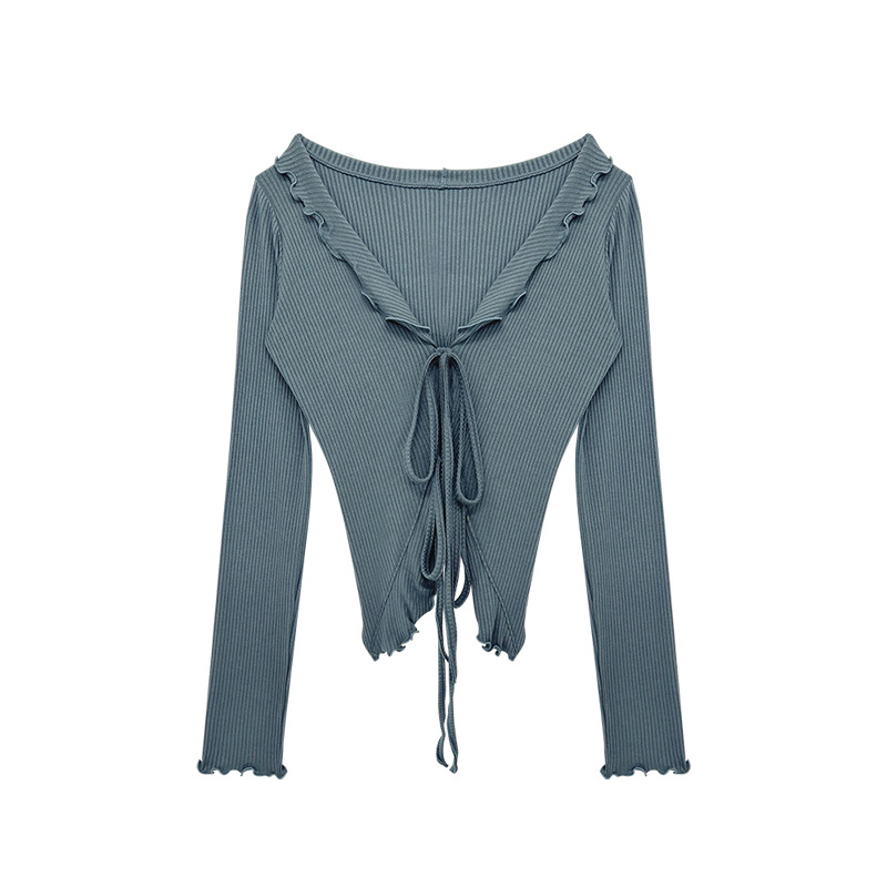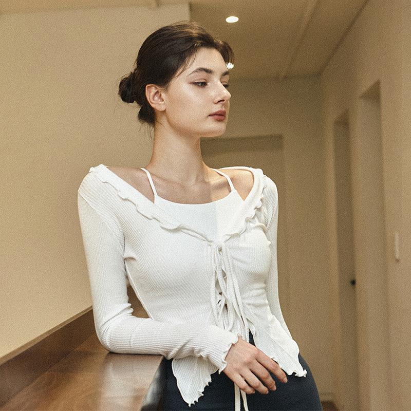 新款鱼尾式甜美瑜伽服系带开衫波浪木耳边修身健身运动上衣长袖女