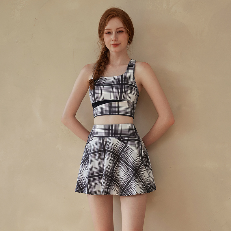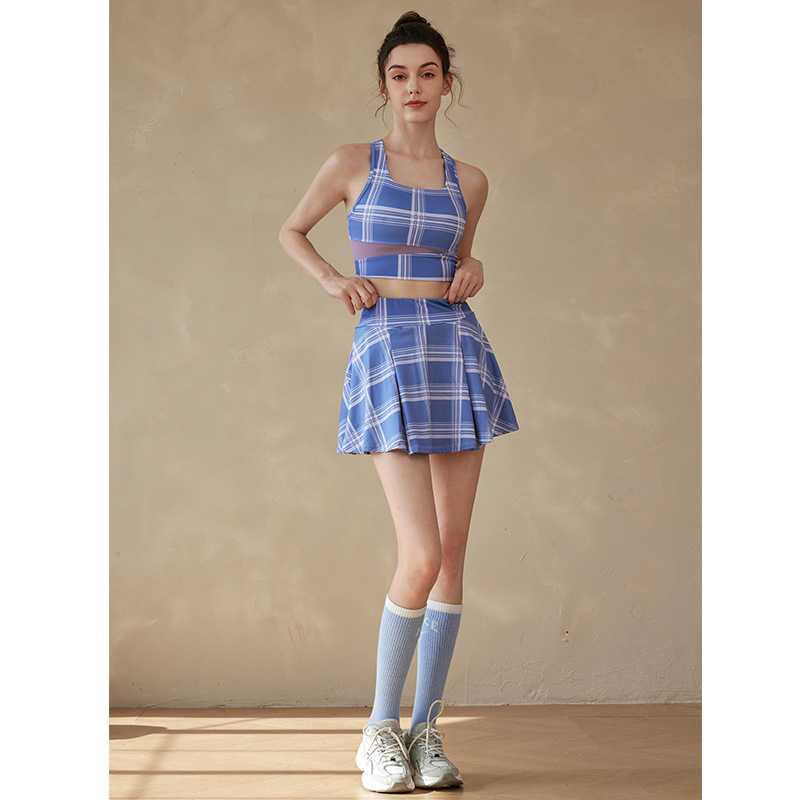 新款运动裙套装格子撞色时尚ins健身背心训练跑步健身裸感亲肤女