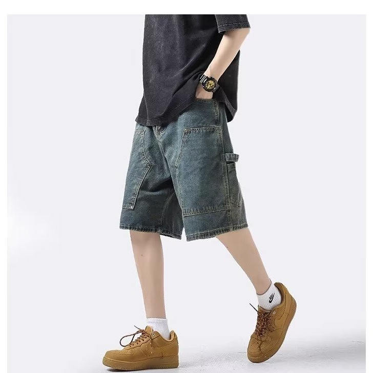 工装牛仔短裤男夏季薄款潮牌宽松直筒五分裤美式水洗休闲裤子