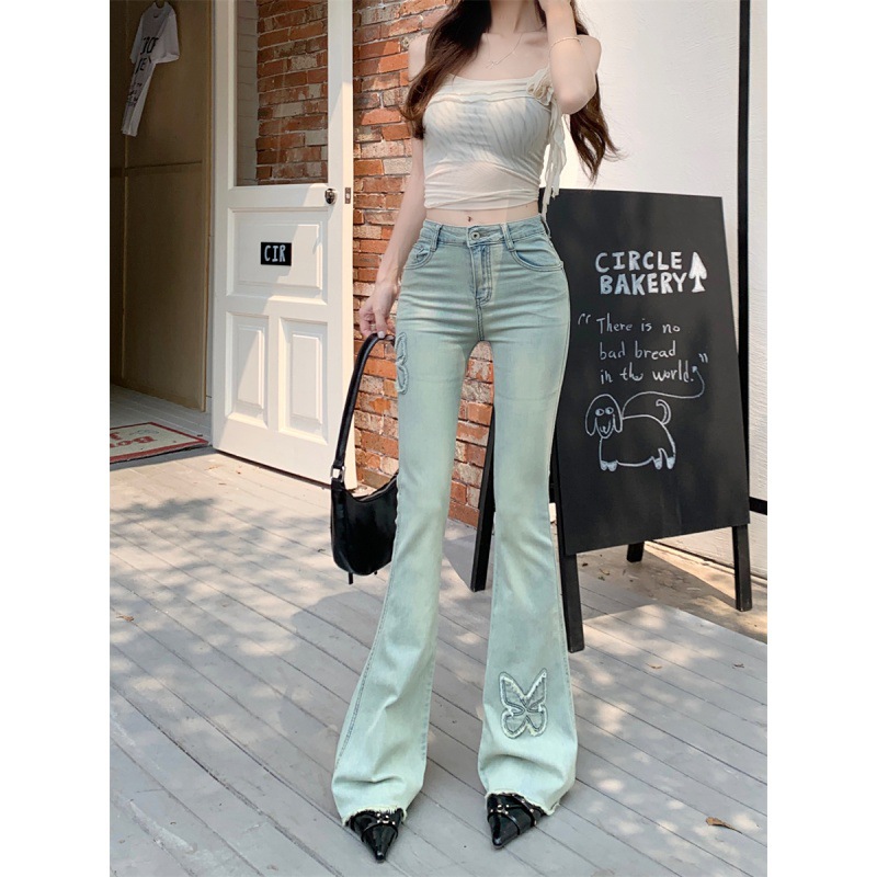 夏季新款高腰弹力复古辣妹刺绣毛边微喇叭牛仔裤女