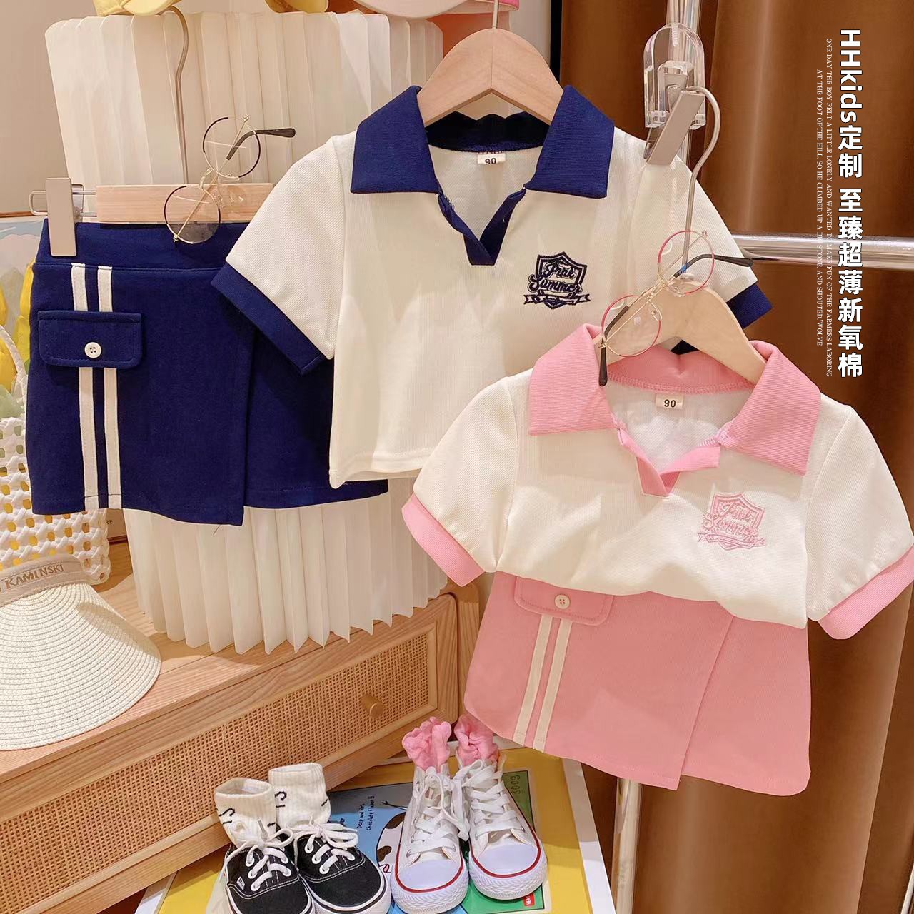 女童套装Polo领洋气刺绣贴标打底衫短裙两件套2025夏装