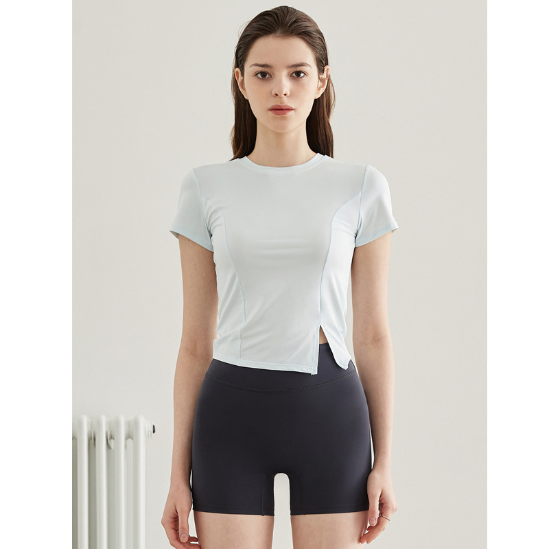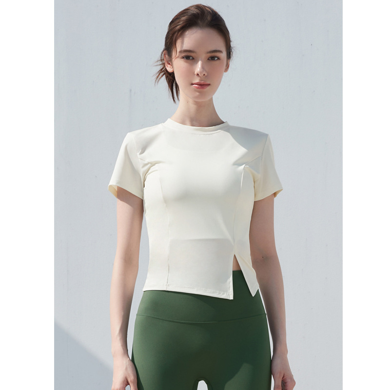 夏季新款瑜伽服修身短袖不规则设计下摆开叉透气健身T恤透气上衣
