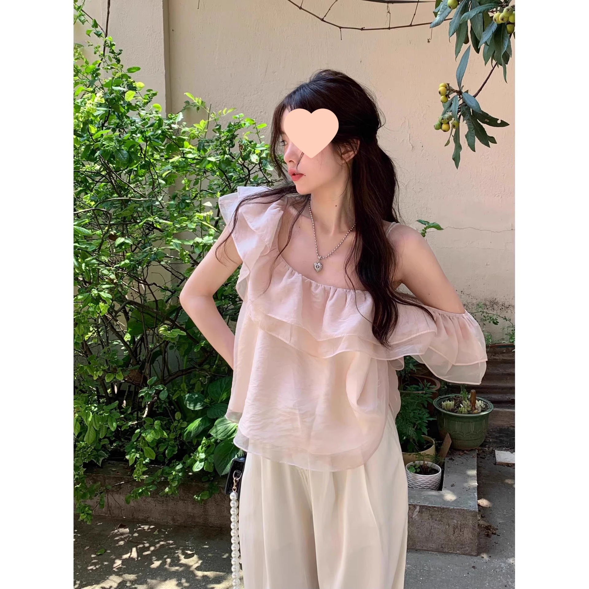 法式不规则吊带一字肩上衣女感小众设计夏季新款荷叶边衬衫潮