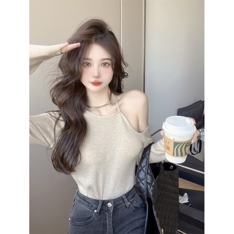 纯欲辣妹性感一字肩挂脖上衣女早秋装别致独特漏肩长袖内搭打底衫