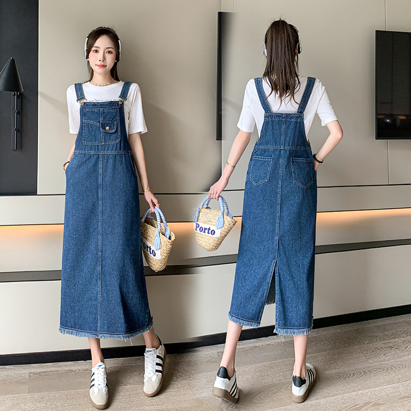 休闲百搭牛仔背带裙中长款显瘦连衣裙女春夏新款毛边A字裙女