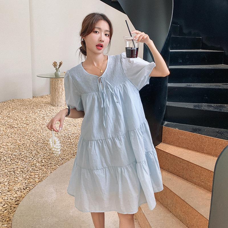 实拍小V领蝴蝶结系带元气少女感泡泡袖娃娃裙水蓝色A字裙摆连衣裙