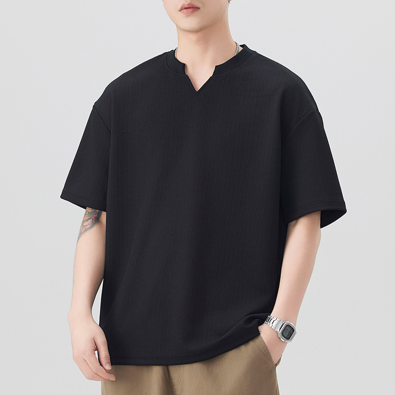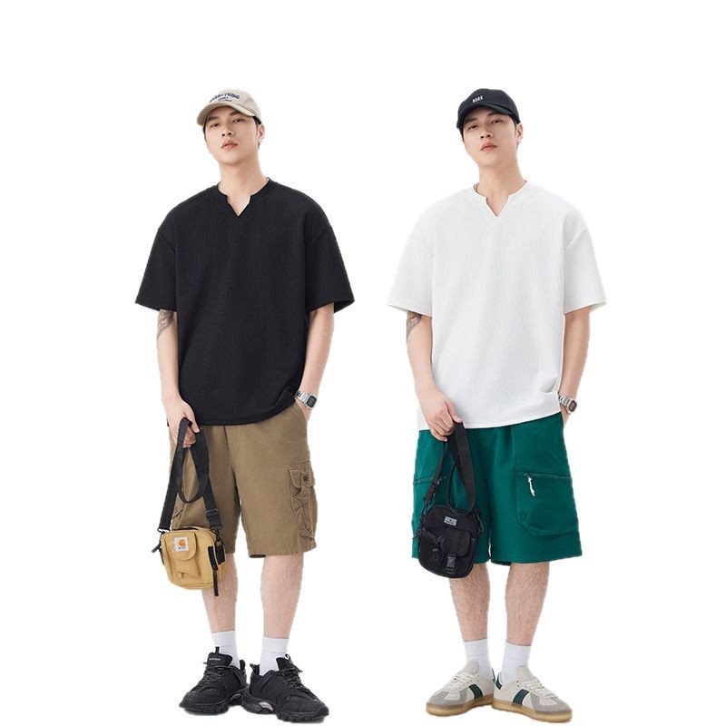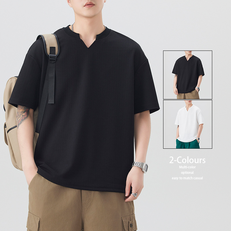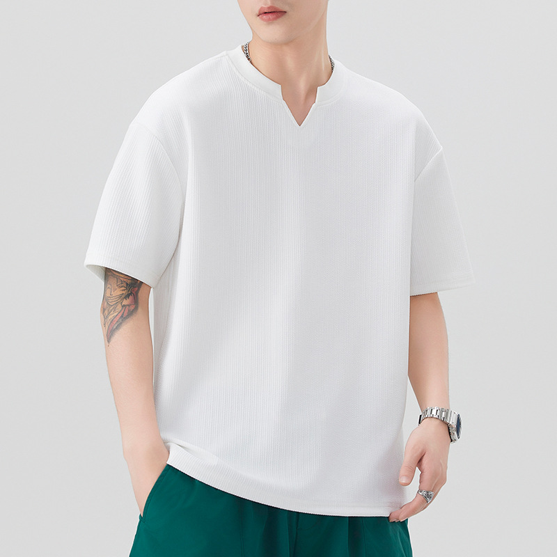 白色短袖t恤男2025夏季肌理感V领半袖男休闲宽松上衣冰丝凉感体恤