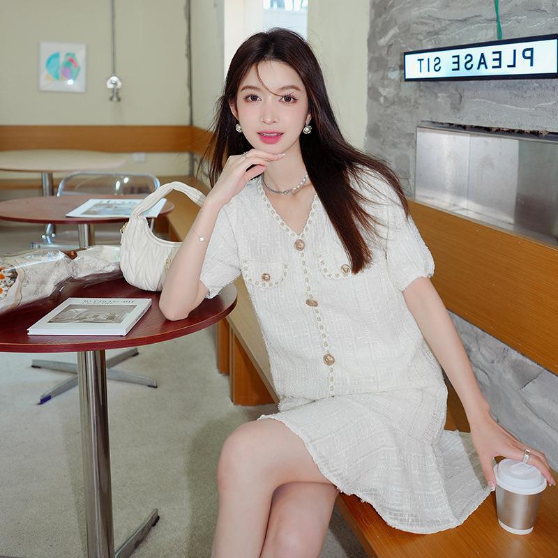 实拍ins别致单排扣V领小香风宽松显瘦白色拼接裙摆小众纹理连衣裙
