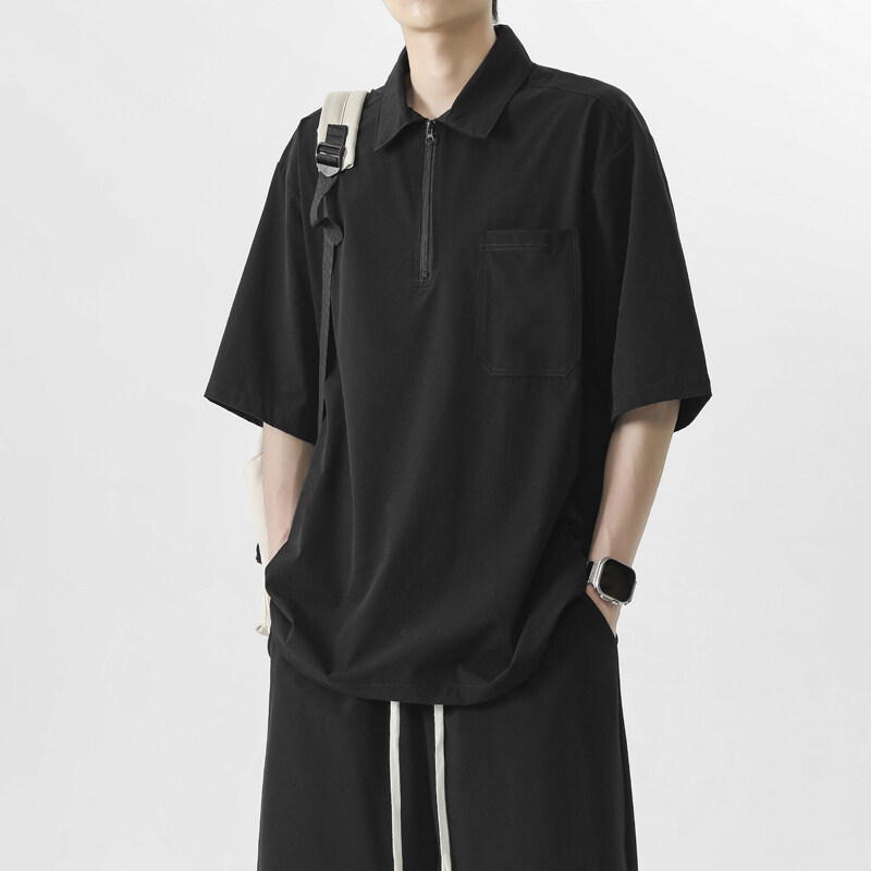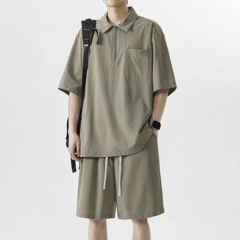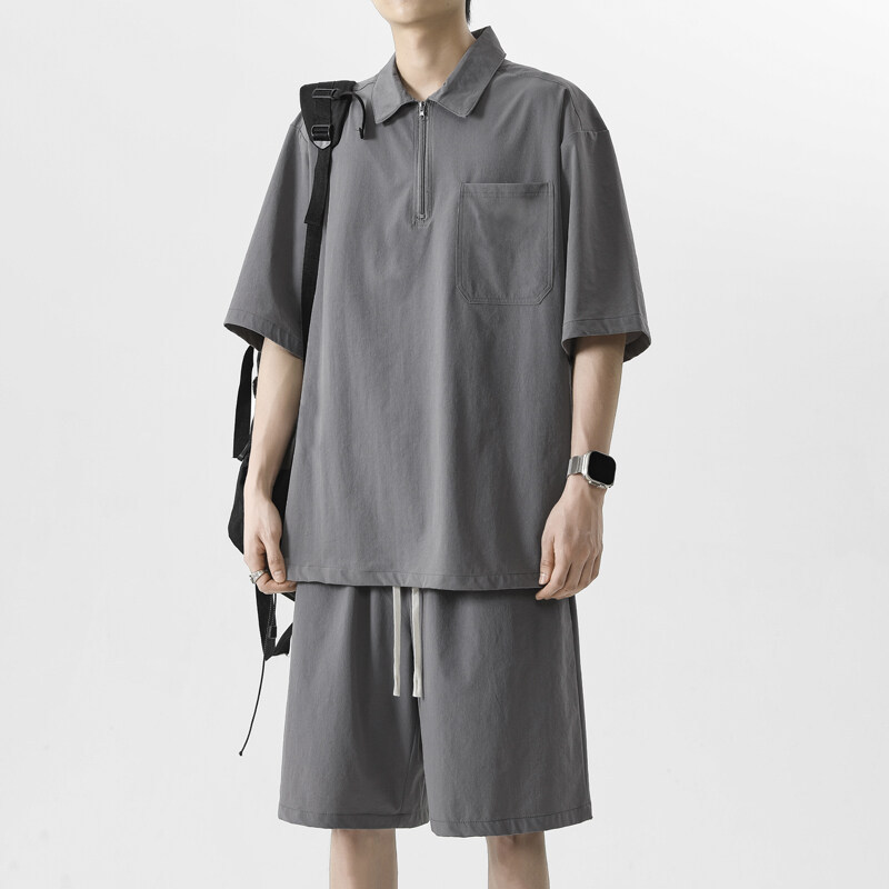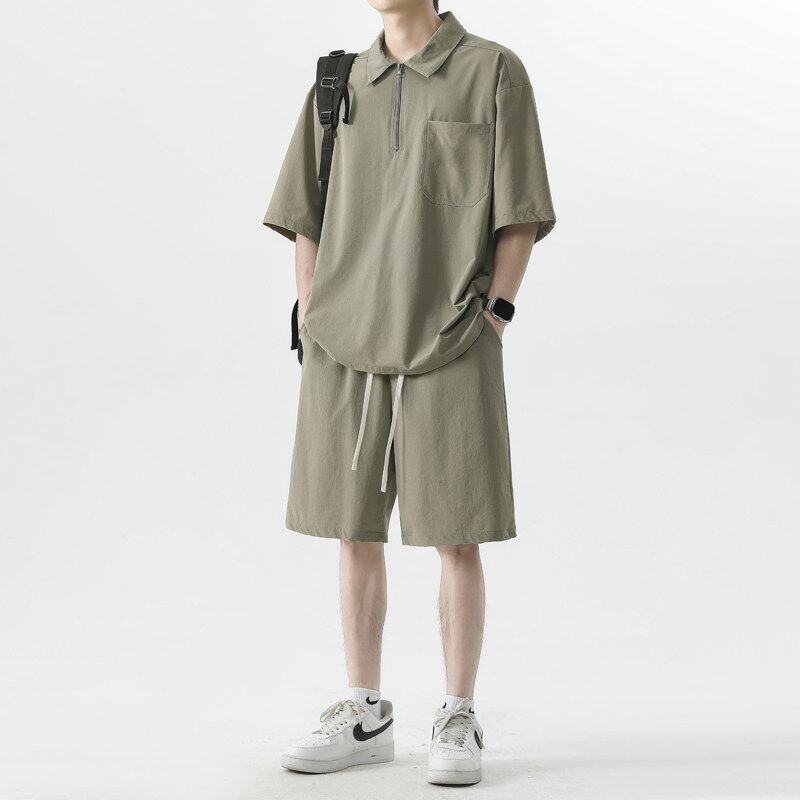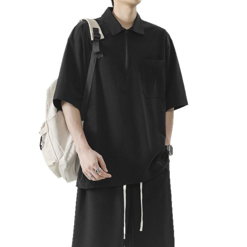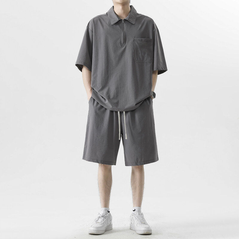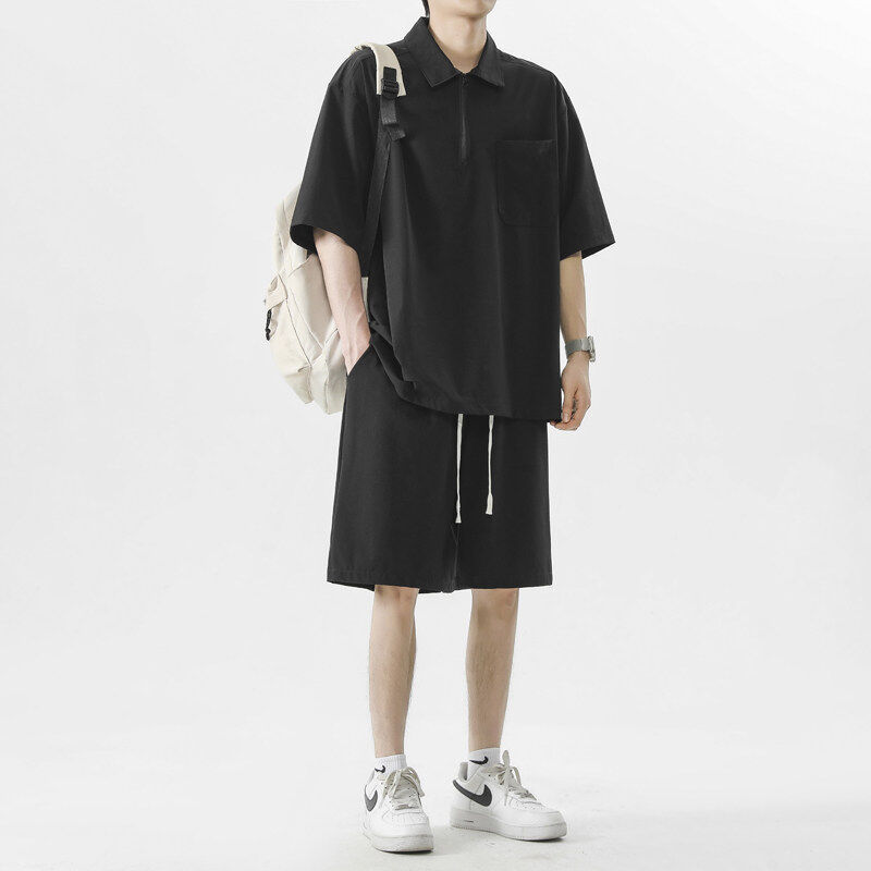男生夏季冰丝polo衫套装速干半拉链短袖t恤宽松痞帅运动休闲套装