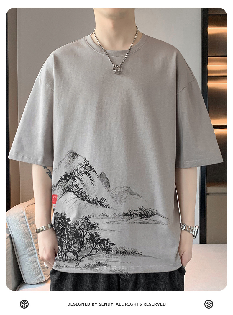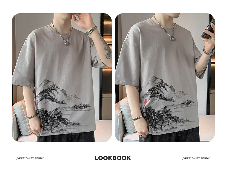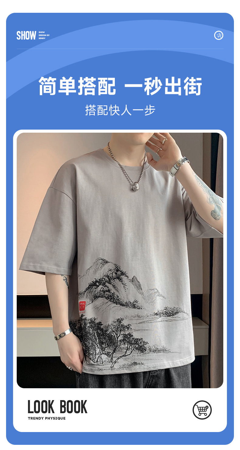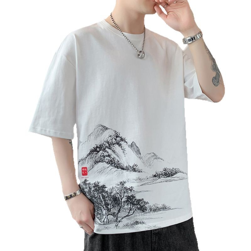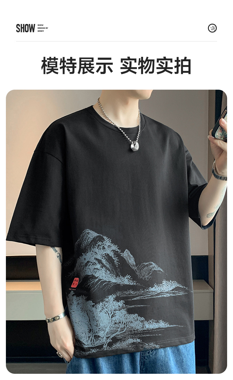 新中式短袖t恤男士夏季薄款潮牌宽松圆领棉复古半袖休闲上衣服潮