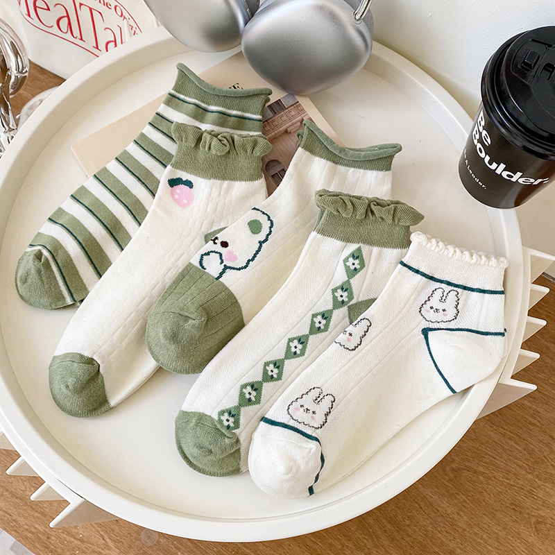 袜子女春夏小清新船袜女卡通兔子短筒女袜绿色系罗口花边短袜女