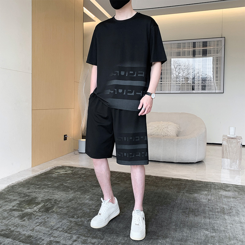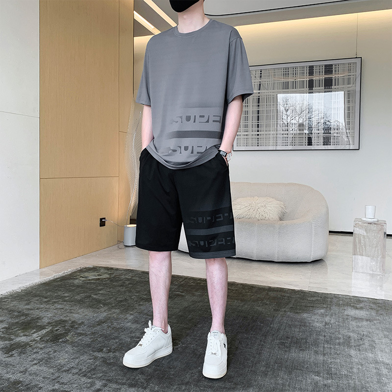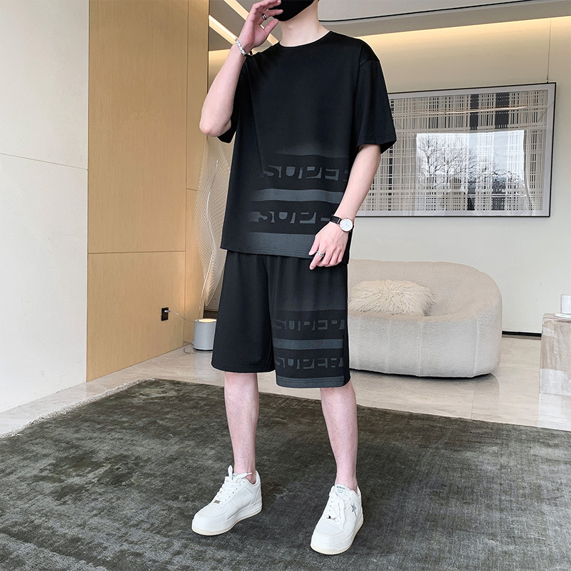 新款短袖t恤套装男士夏季冰丝薄款帅气休闲运动服跑步速干短裤潮