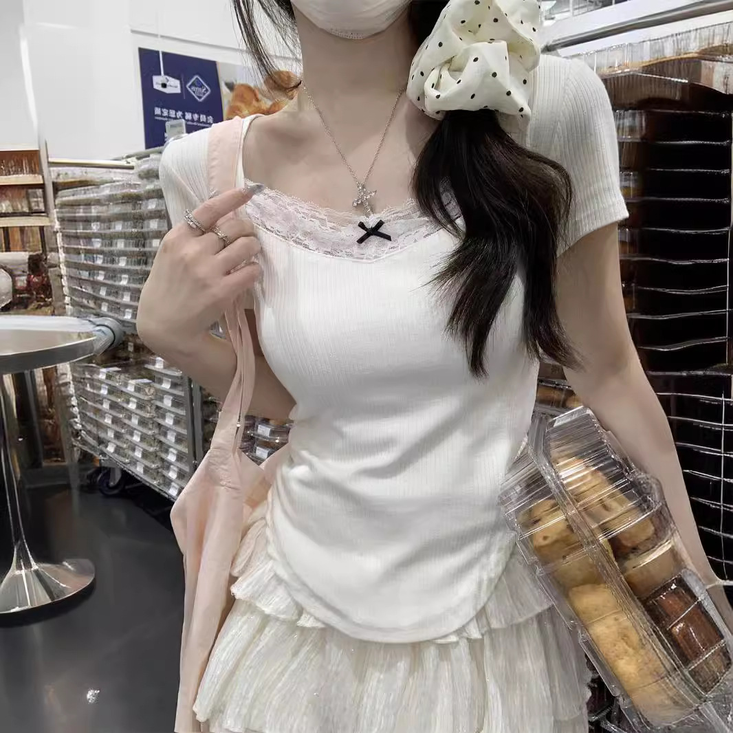 方领蕾丝甜辣风上衣女夏季小众纯欲漏锁骨正肩短袖韩系奶杏色T恤