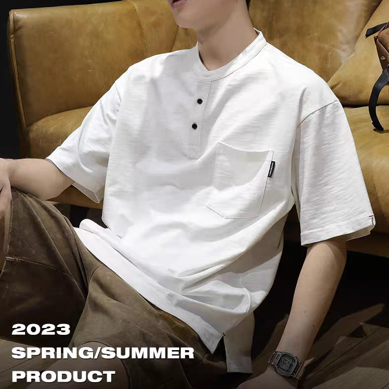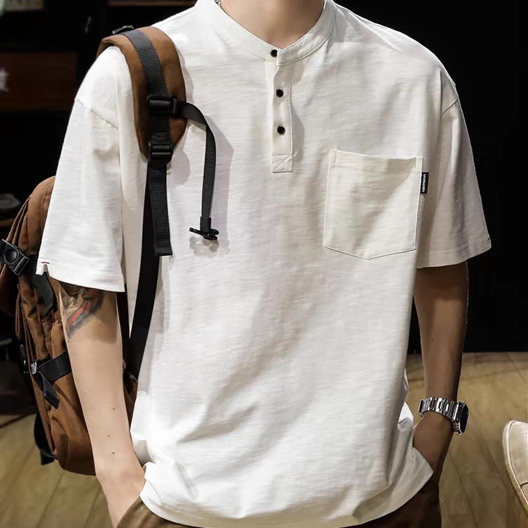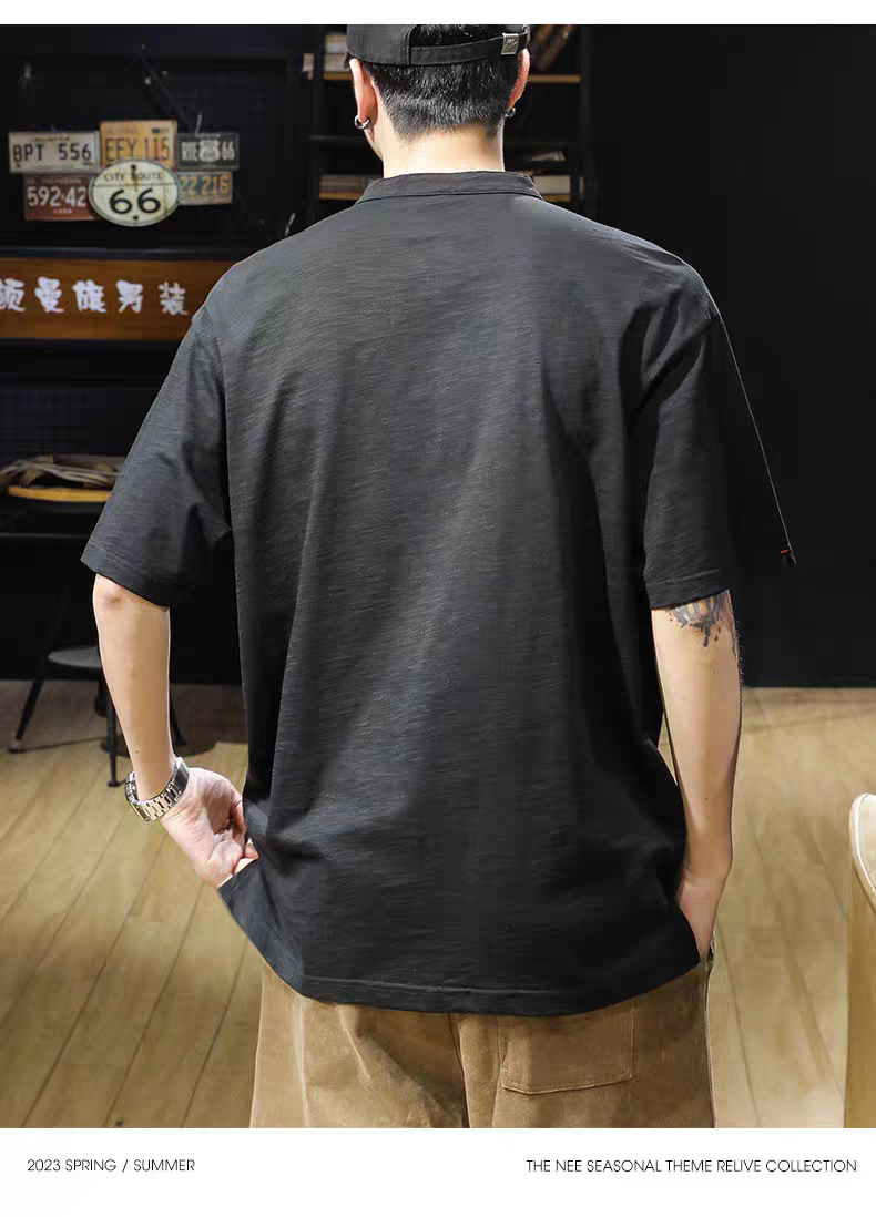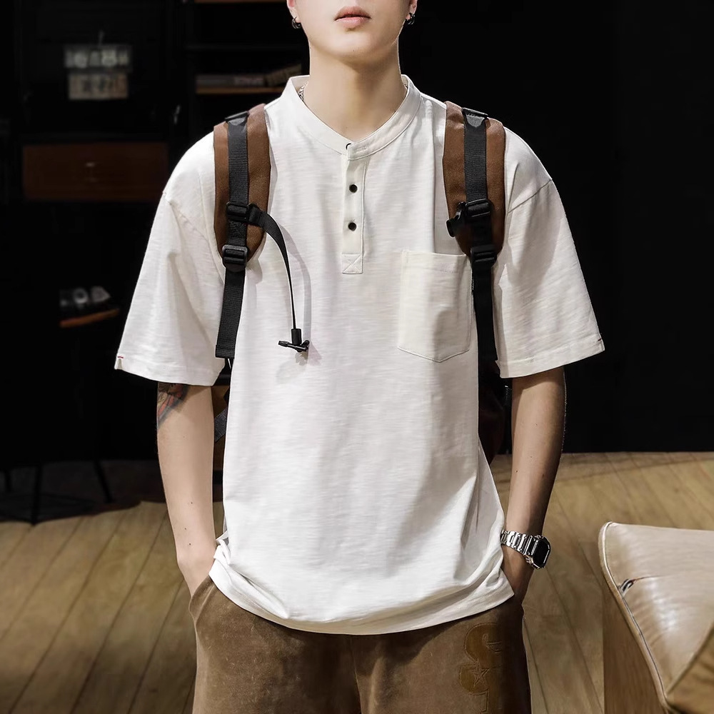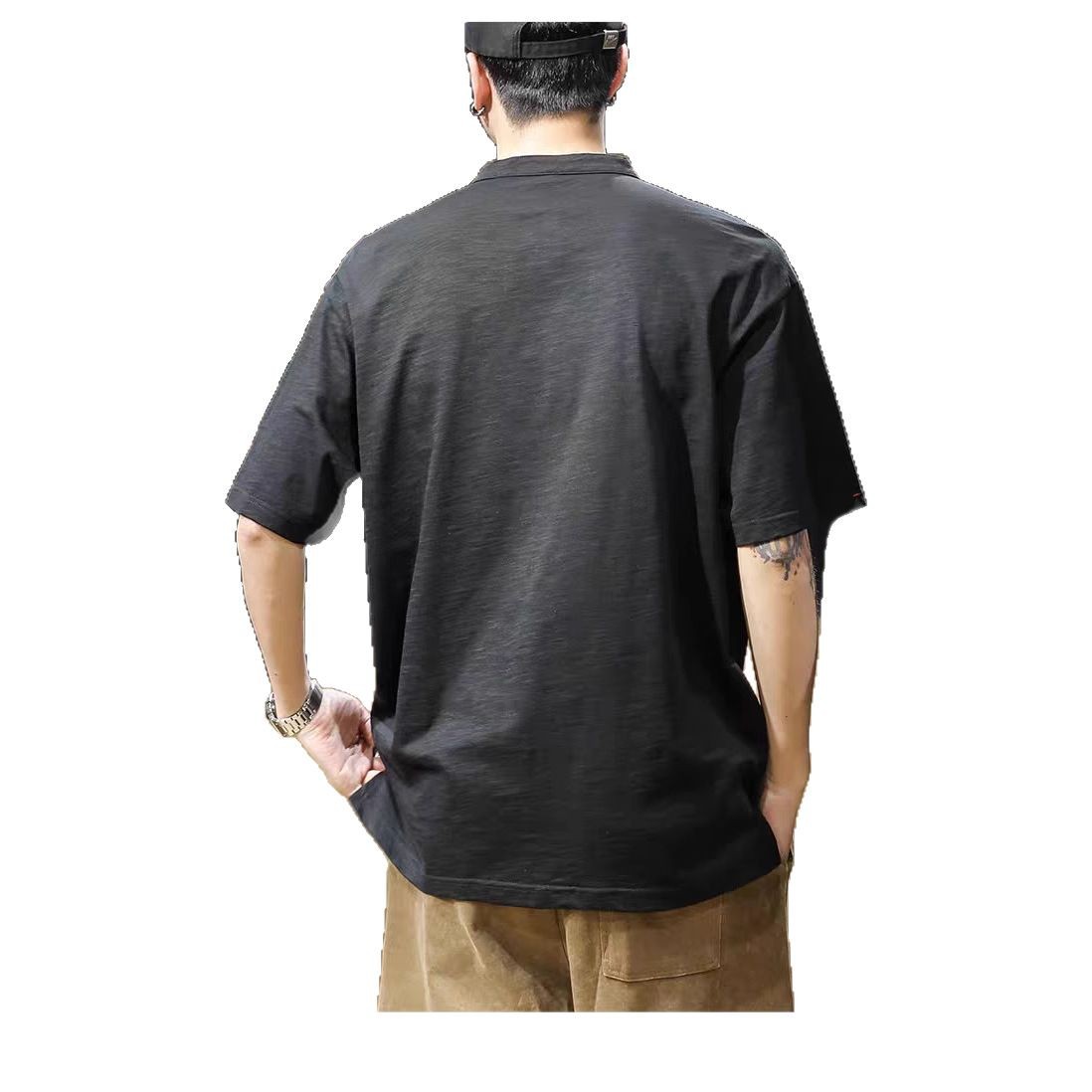 跨境美式经典复古亨利领短袖POLO衫男夏季竹节棉宽松阿美咔叽工装