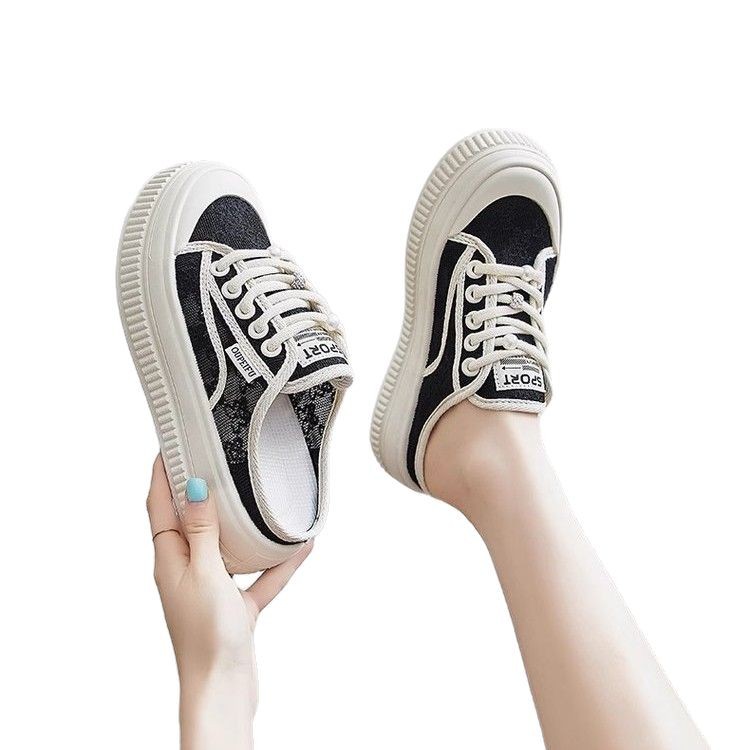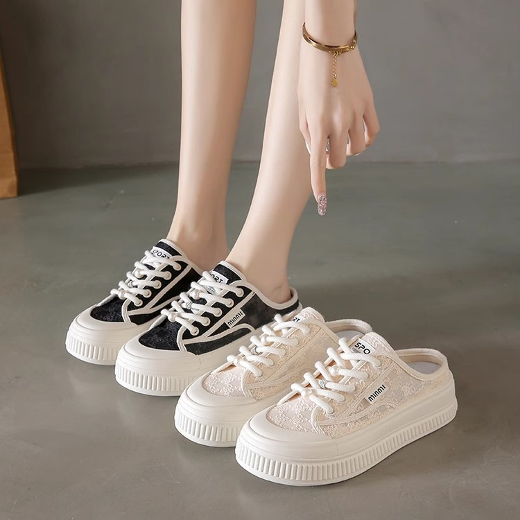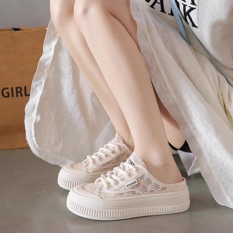 蕾丝网面包头半拖鞋女夏季外穿2025新款无后跟休闲懒人小白凉拖鞋