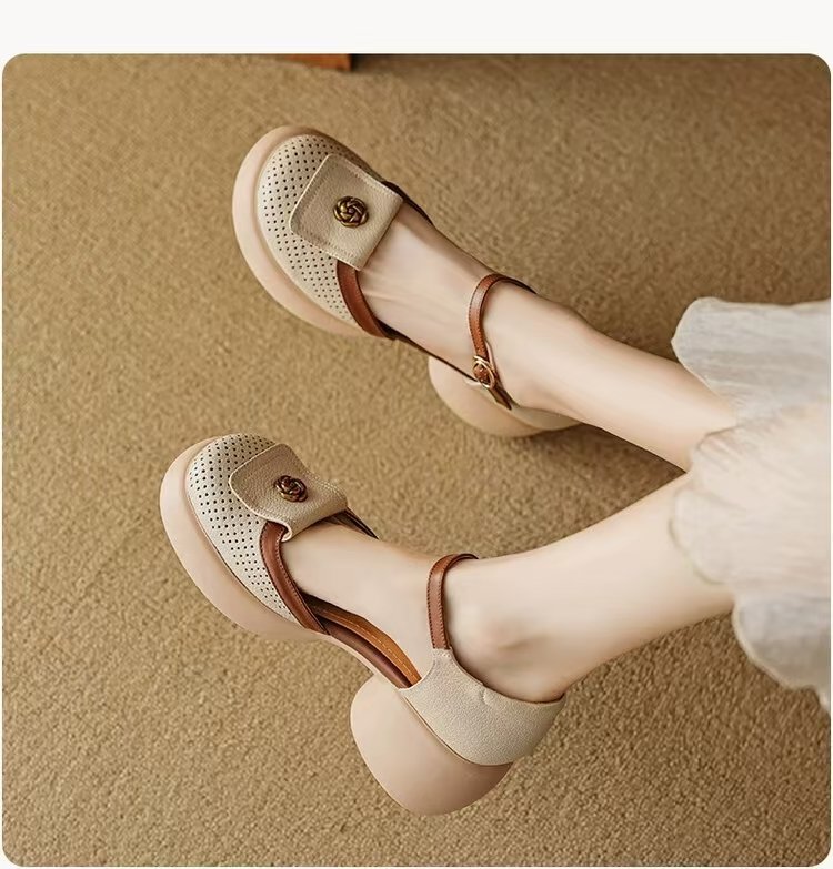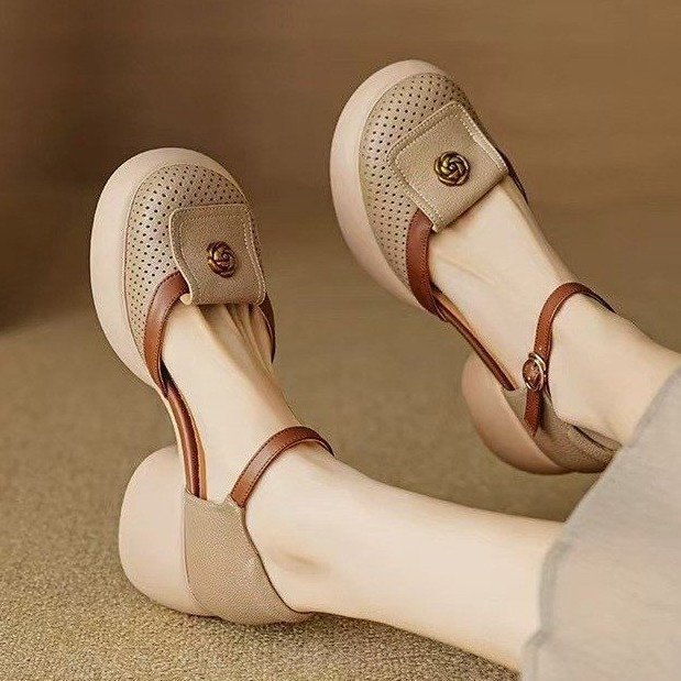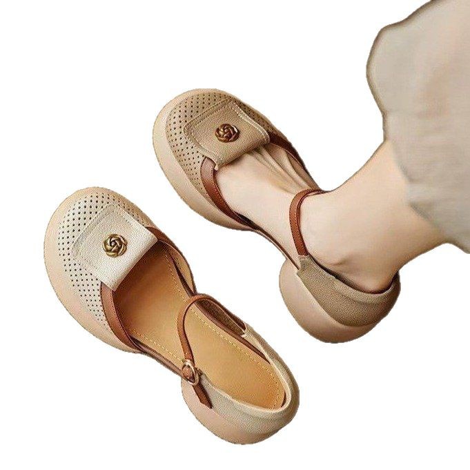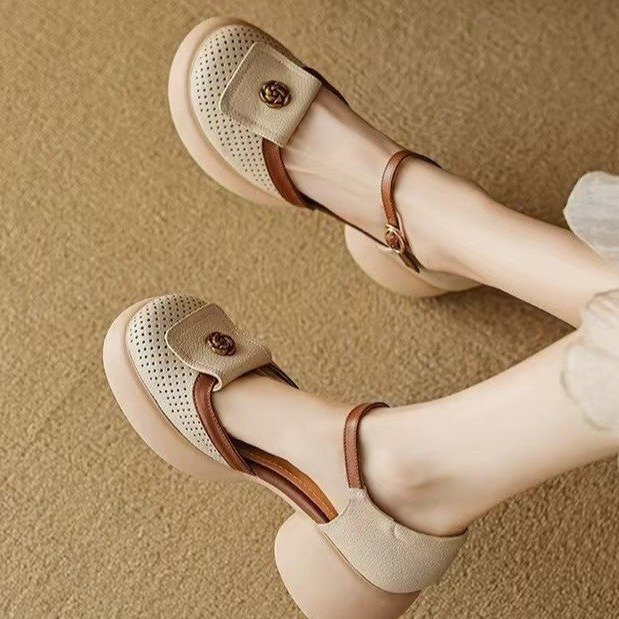 厚底镂空包头凉鞋女松糕透气罗马鞋2025夏季新款配裙一字扣高跟鞋