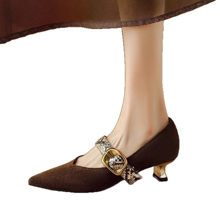 磨砂气质细跟中跟单鞋女2025春季新款一字带扣百搭尖头玛丽珍鞋女