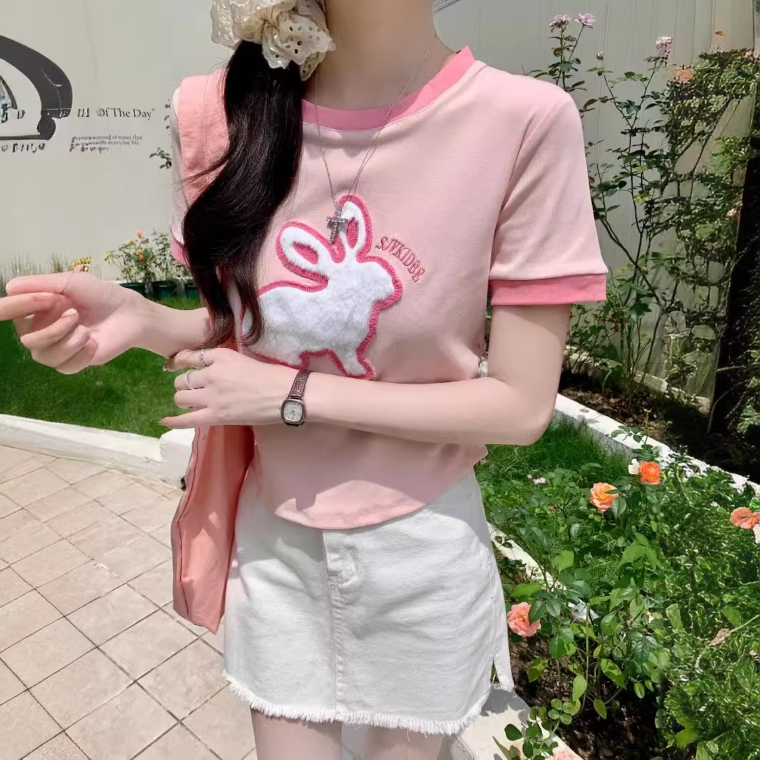 粉色刺绣兔子正肩短袖T恤女夏季甜美洋气短款小众设计感收腰上衣