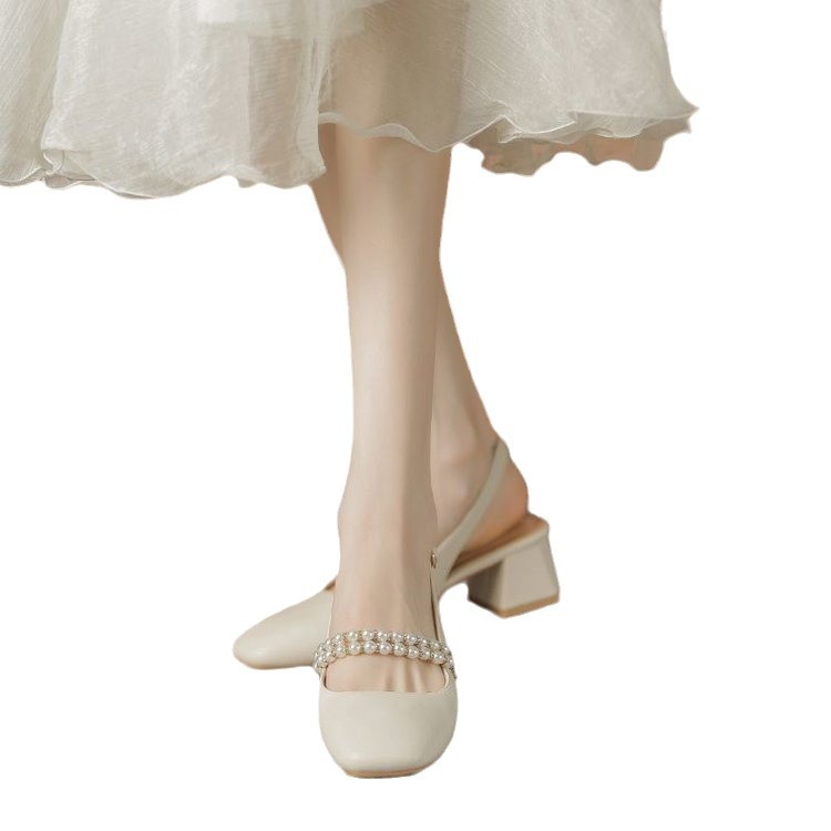 法式包头凉鞋女款2025新款夏季外穿中跟粗跟配裙子罗马珍珠高跟鞋