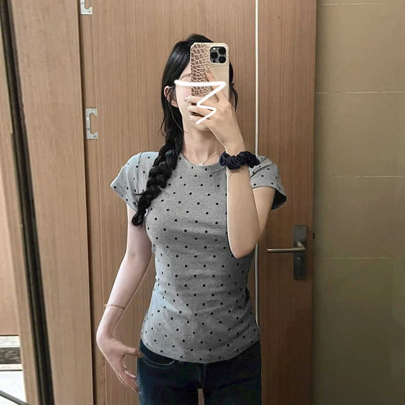 纯棉灰色波点正肩短袖t恤女夏季设计感小众法式修身短款紧身上衣