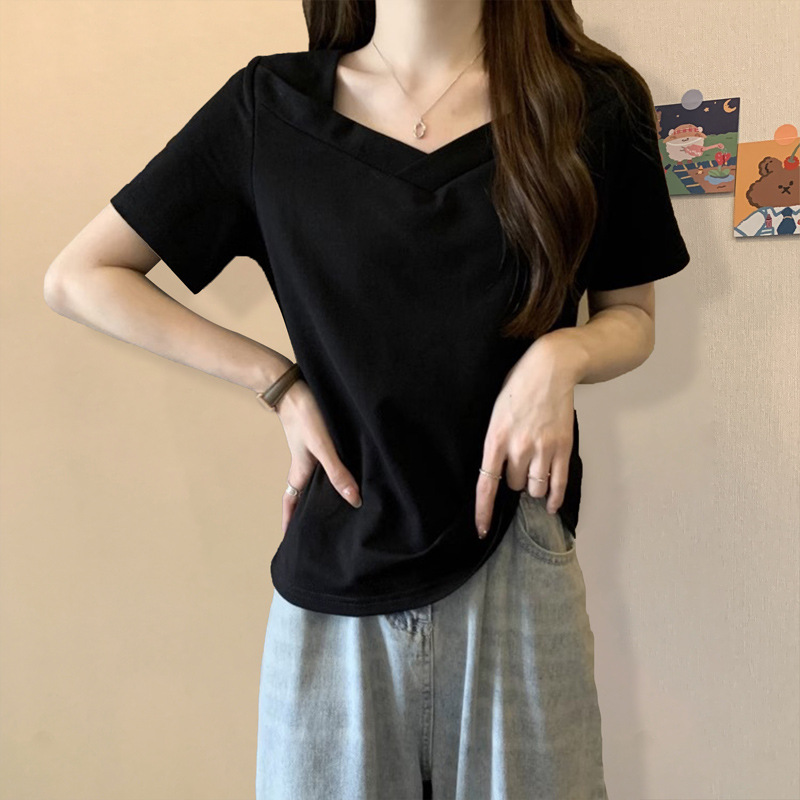 V领短袖t恤女夏季新款宽松显瘦纯色学生辣妹露锁骨上衣设计感