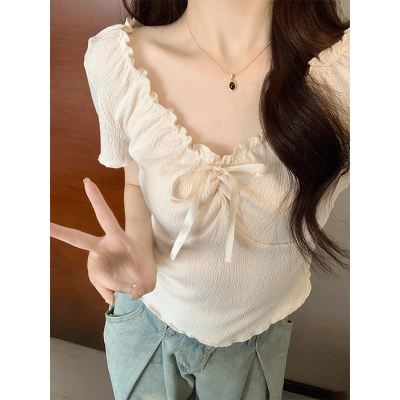 设计感别致木耳边系带半袖短款上衣春夏纯欲蕾丝花边修身短袖t恤