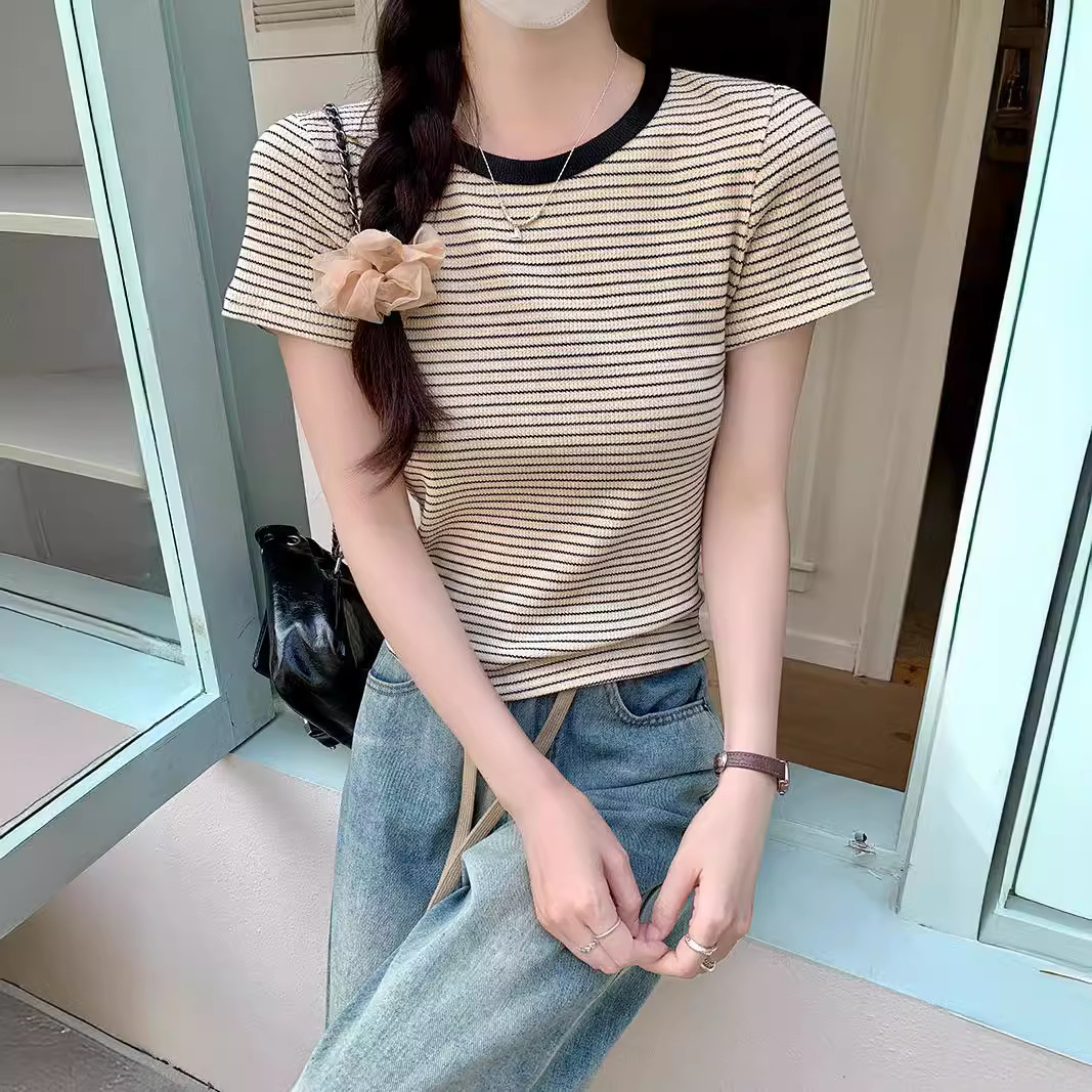 撞色条纹t恤圆领宽松短袖女装宽松大码打底衫夏季2025年半袖上衣