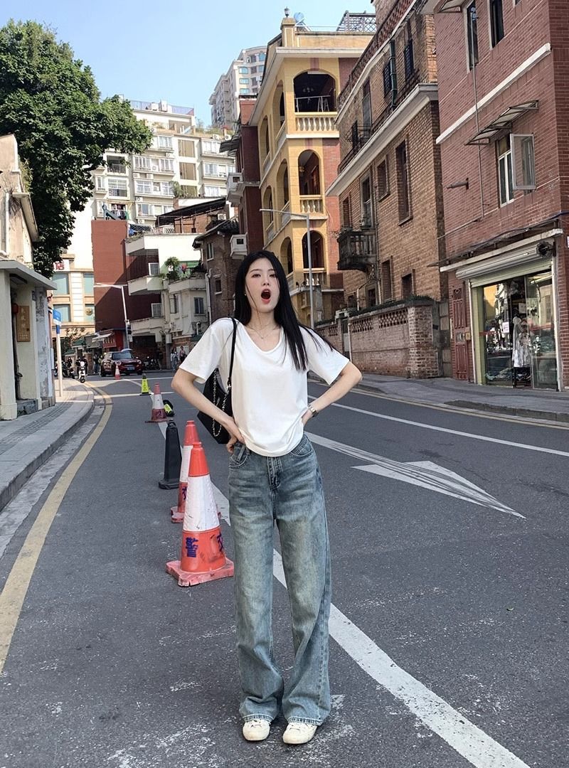 【220克 19支 100%棉】【抖音质量】慵懒风宽松纯色U领短袖T恤女