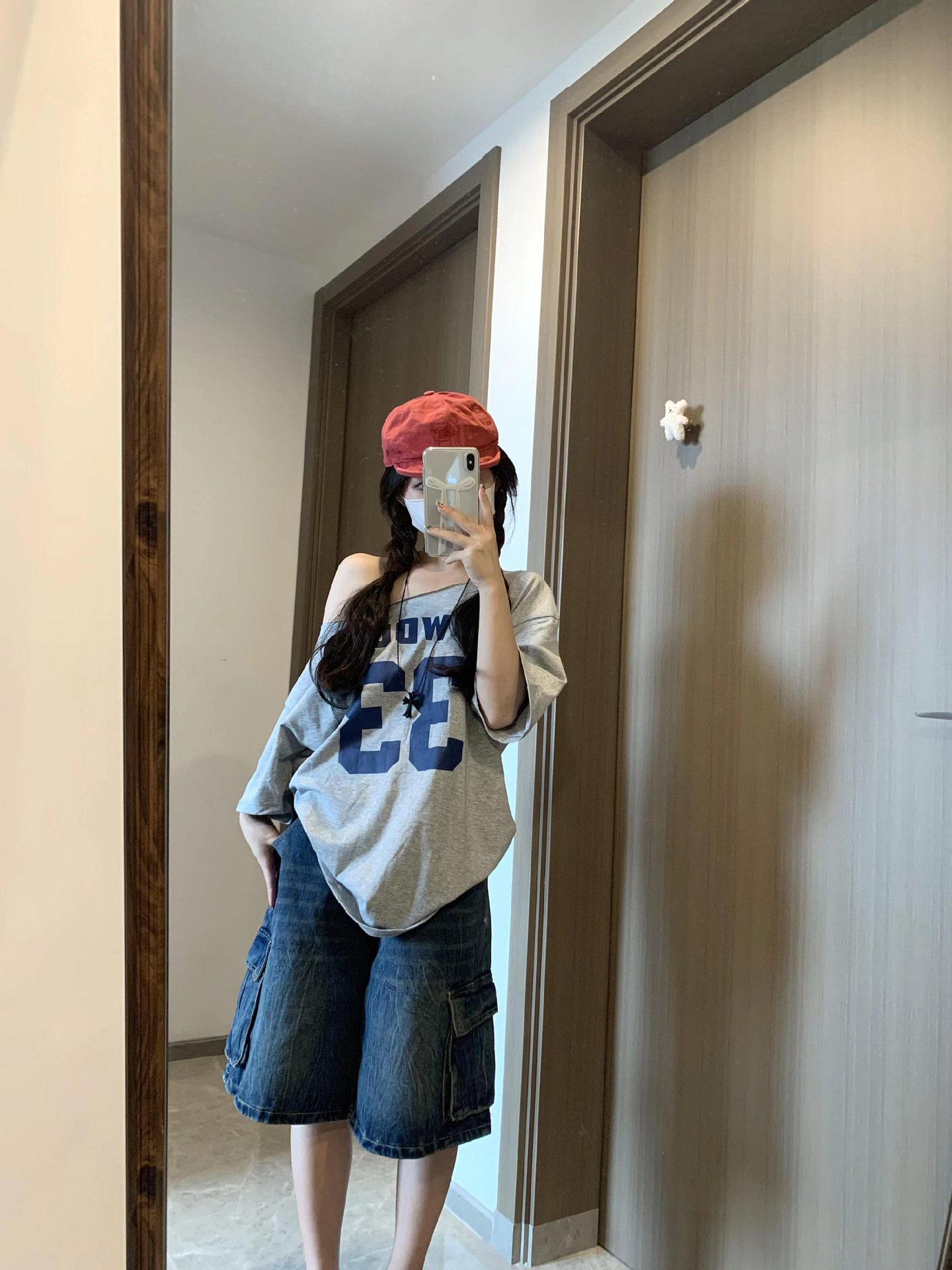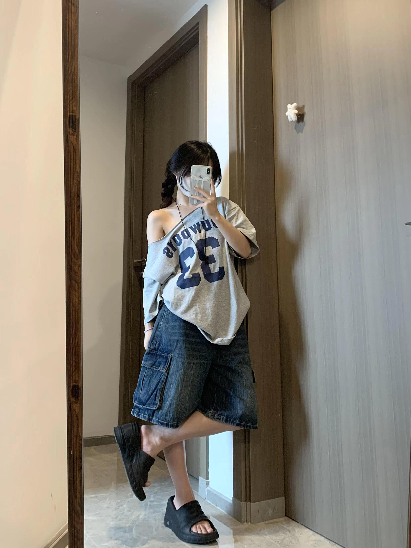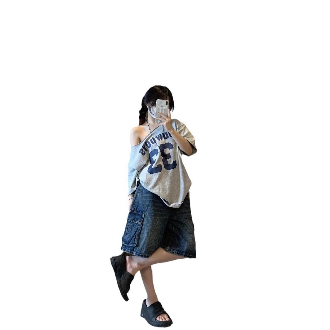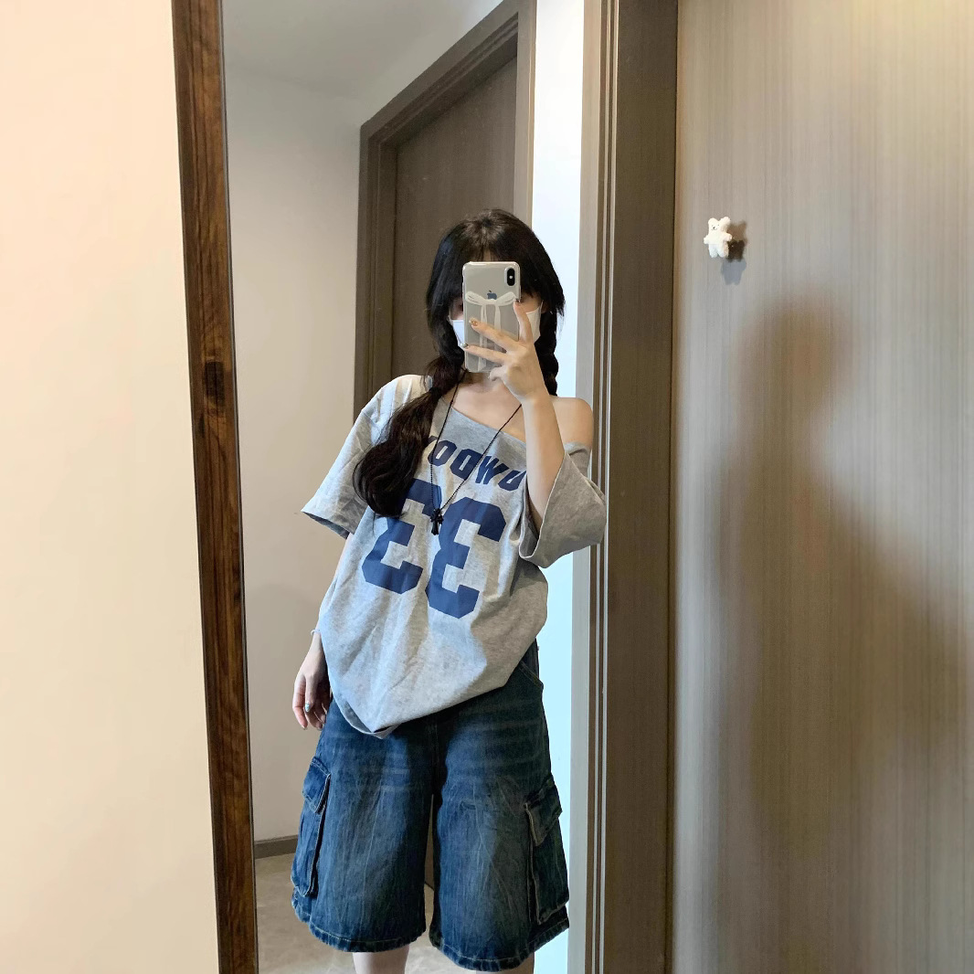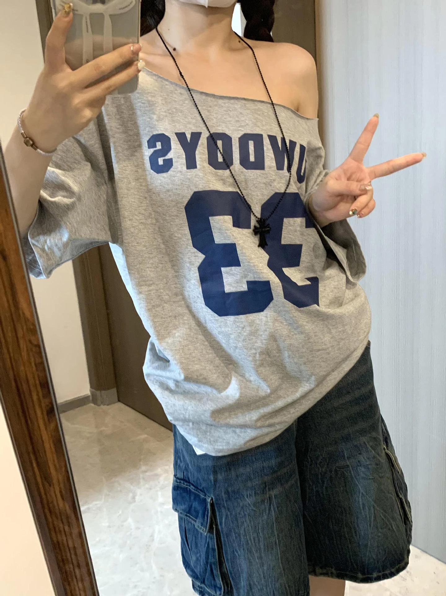 2024新品一字肩 灰色印花字母斜肩短袖T恤女夏慵懒休闲露肩上衣