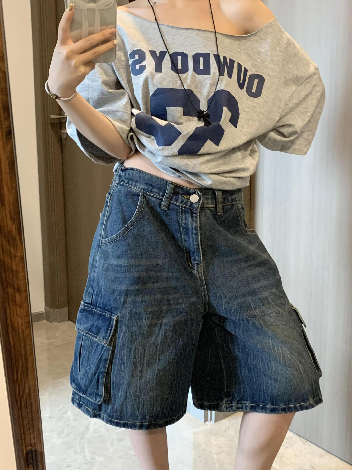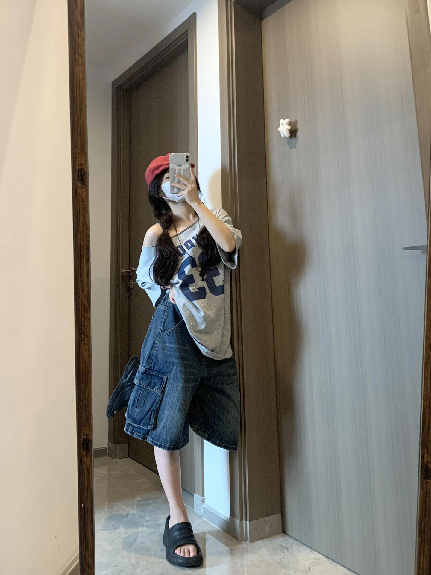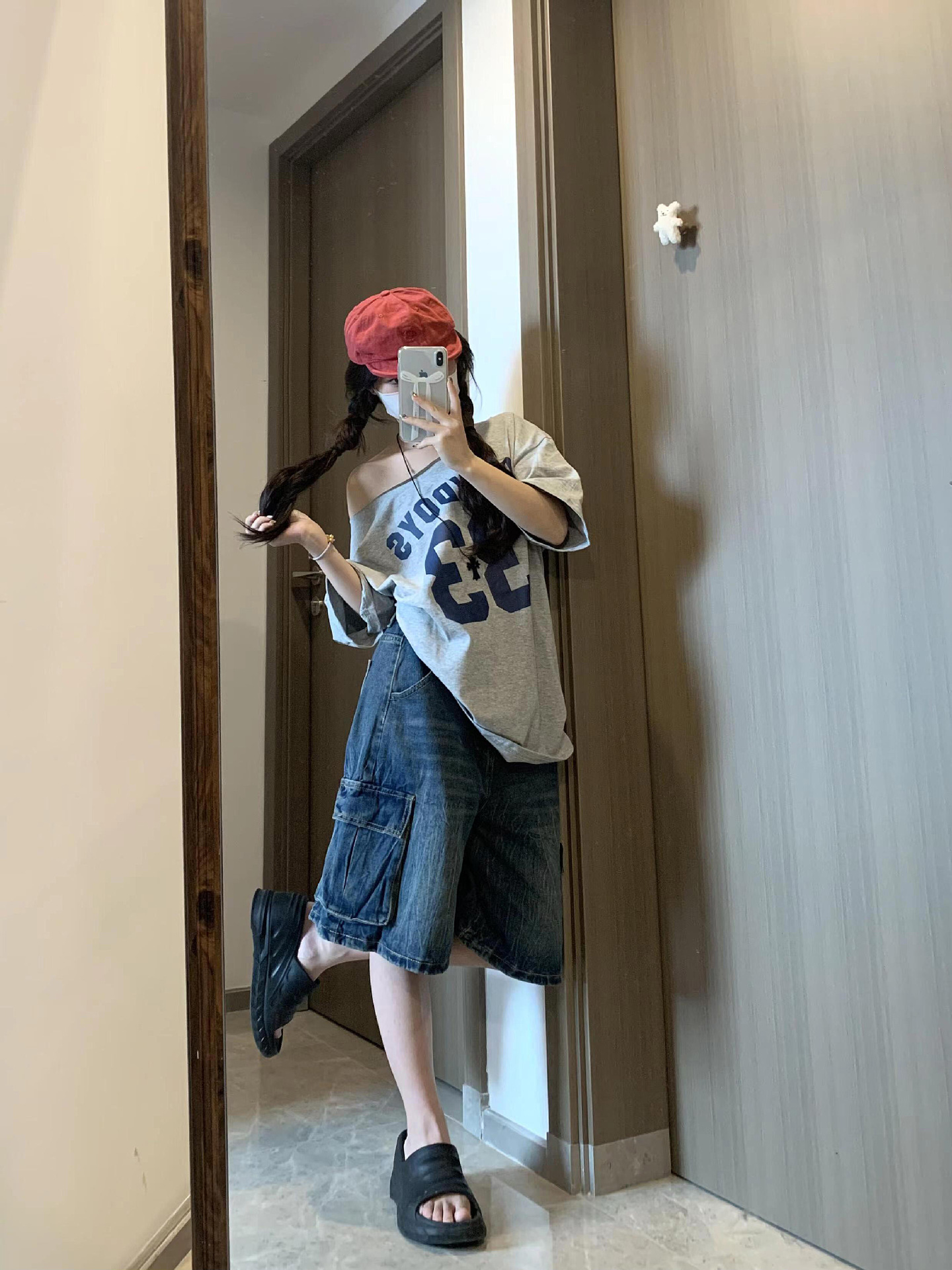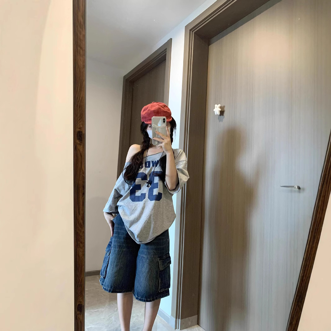 2024新品一字肩 灰色印花字母斜肩短袖T恤女夏慵懒休闲露肩上衣