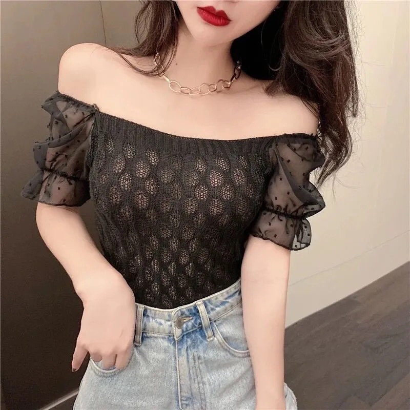 纯欲风针织衫性感网纱镂空一字领短袖雪纺T恤短款修身女上衣