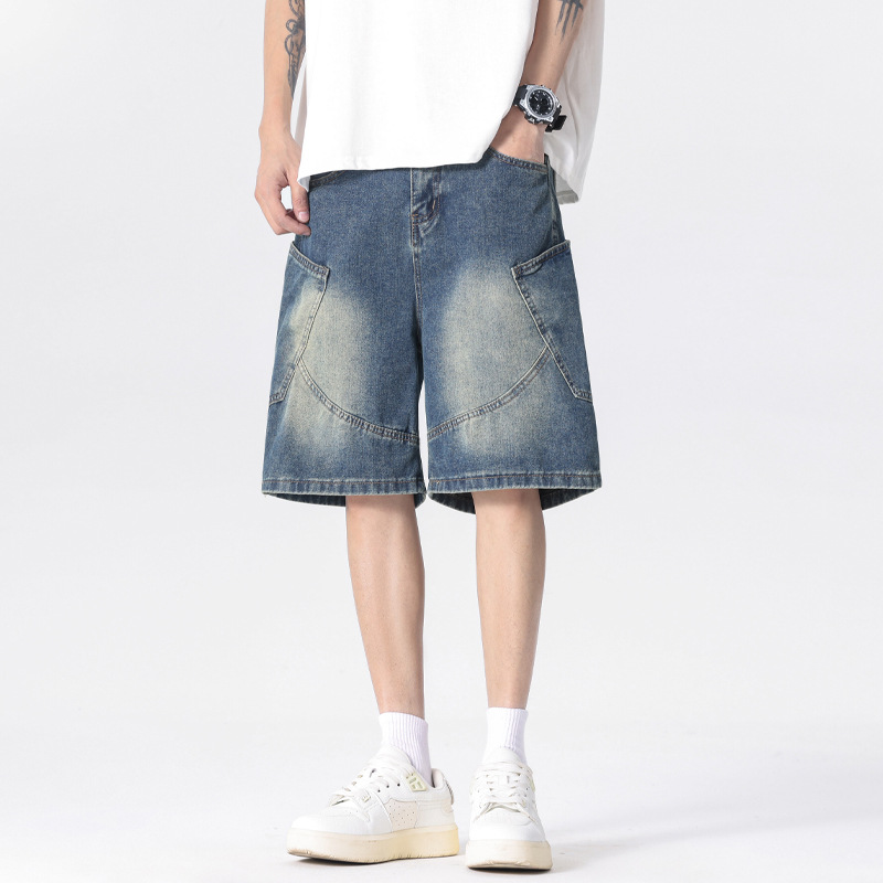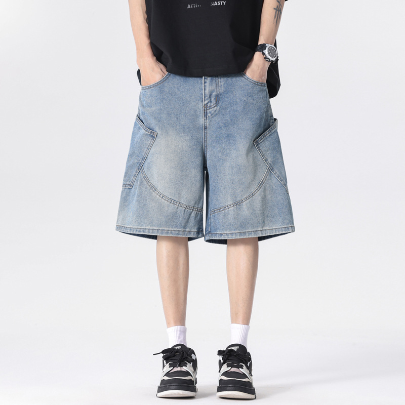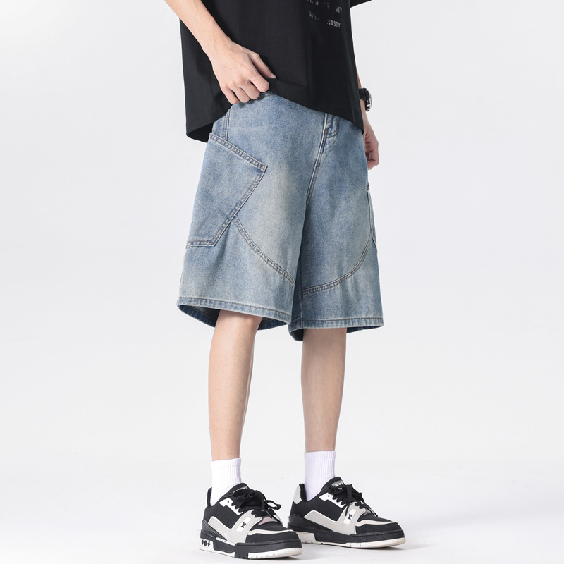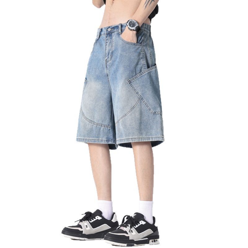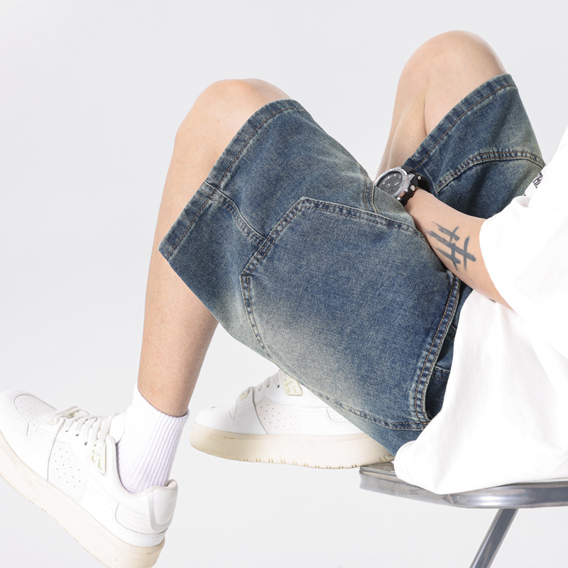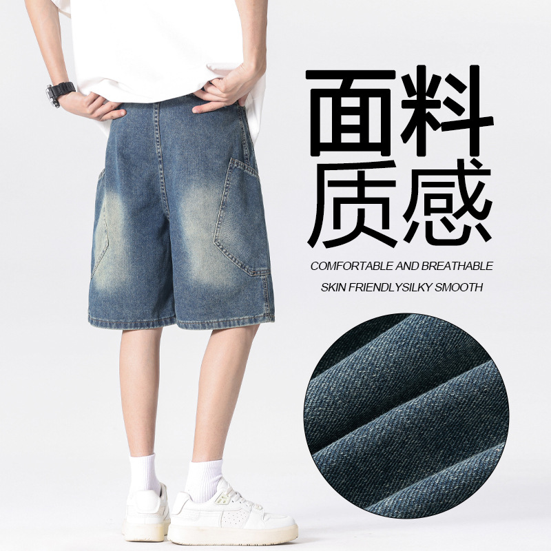牛仔短裤男士潮流美式复古工装休闲五分裤子夏季薄款宽松直筒中裤