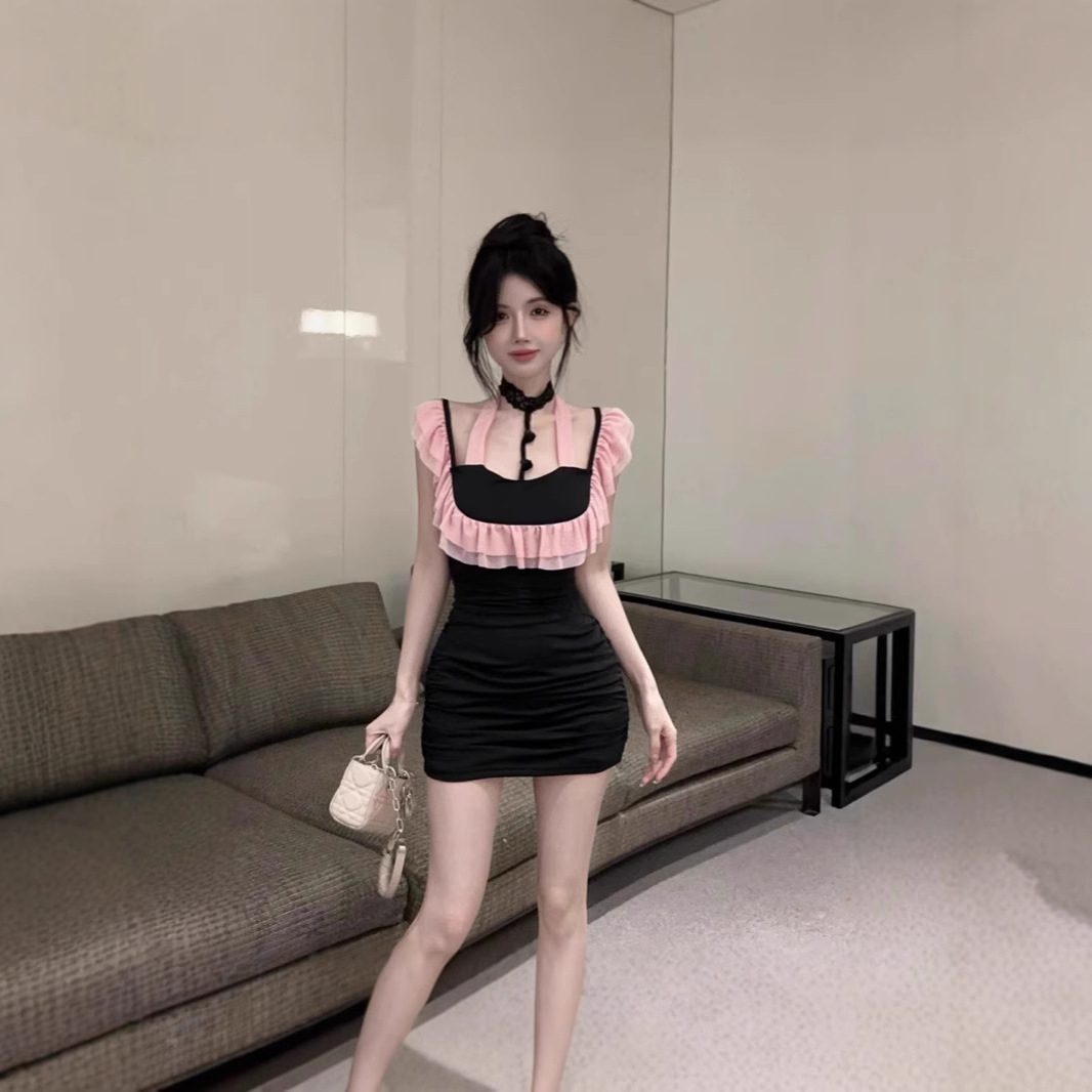 设计感气质荷叶边挂脖辣妹纯欲无袖拼接修身包臀性感主播连衣裙女