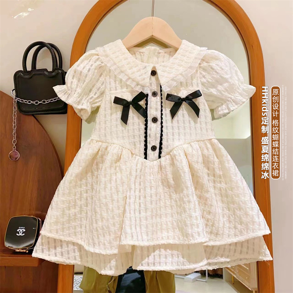 新品女童小香风泡泡短袖蝴蝶结洋气公主连衣裙2025夏装
