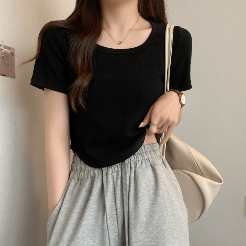 设计感修身显瘦弧形下摆短款上衣女夏季螺纹打底衫短袖t恤女