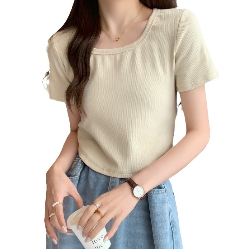 #精梳纯棉# 桃心方领短袖T恤女2025夏新款褶皱修身正肩上衣打底衫