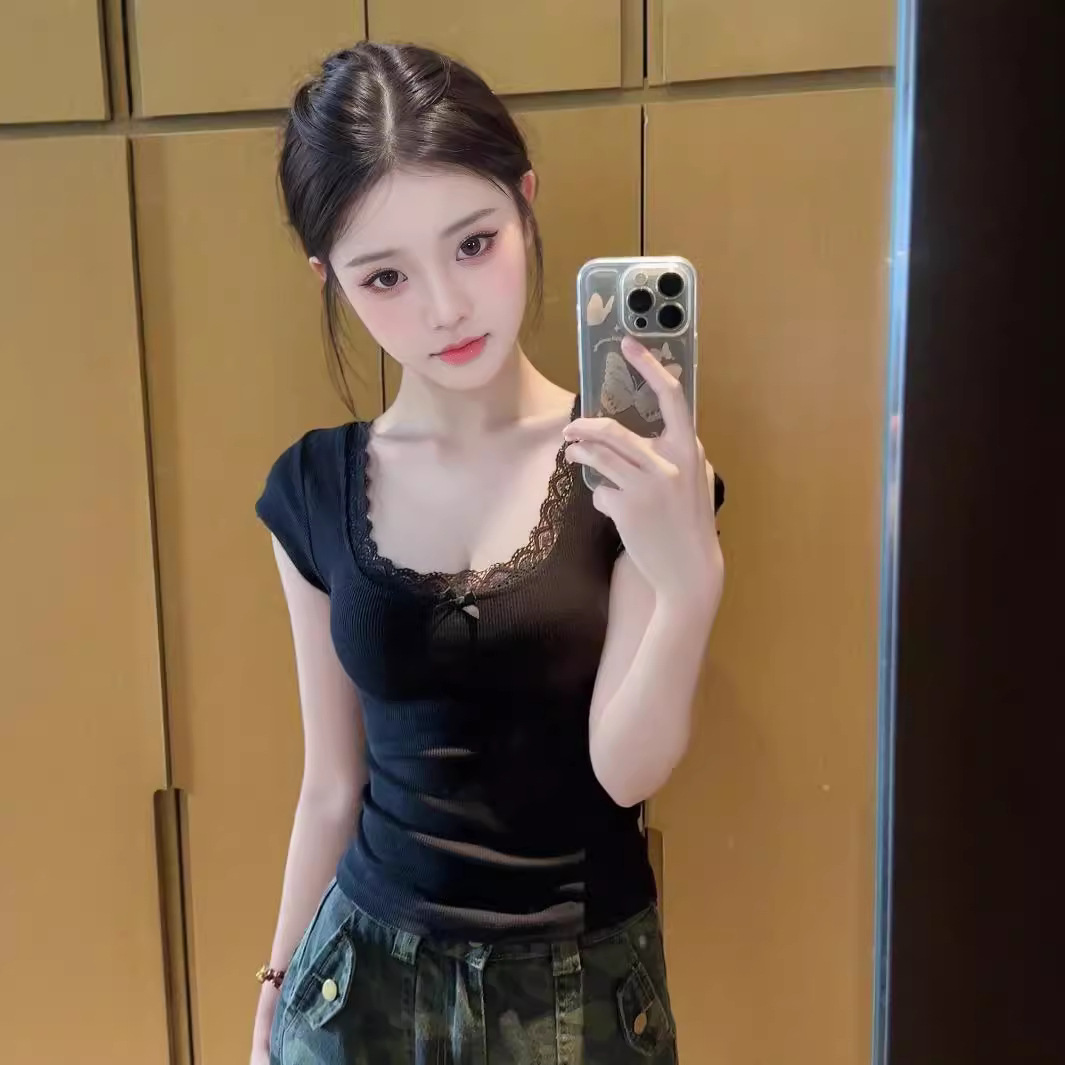 U领蕾丝花边T恤女夏季紧身显瘦辣妹风正肩上衣高级感黑色短袖