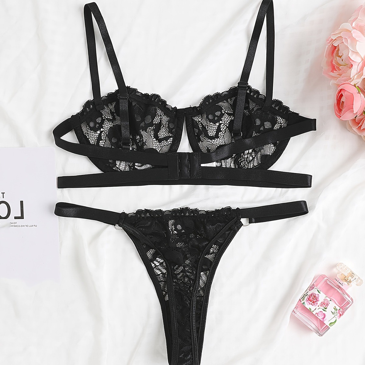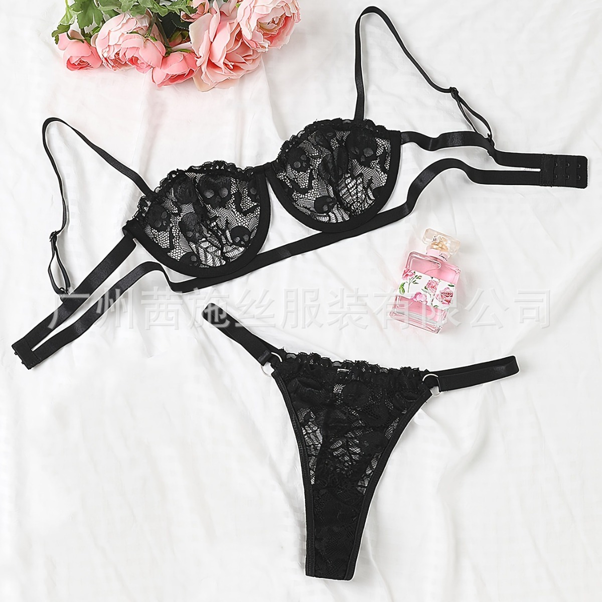 4010 欧美跨境新款文胸超薄情趣透明网纱红唇刺绣纯欲风性感套装