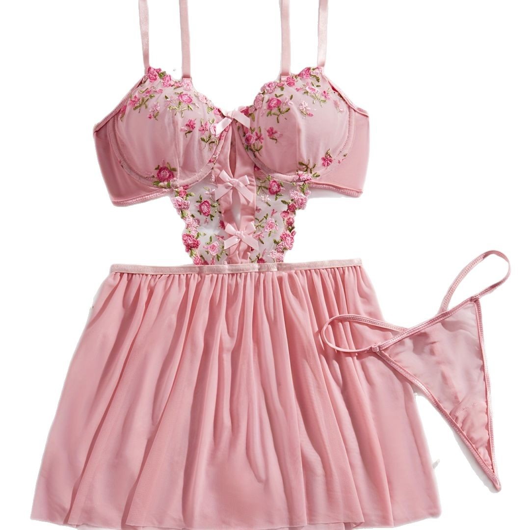 7152 跨境派对婚礼纯欲吊带甜美碎花刺绣网纱聚拢文胸钢圈套装裙