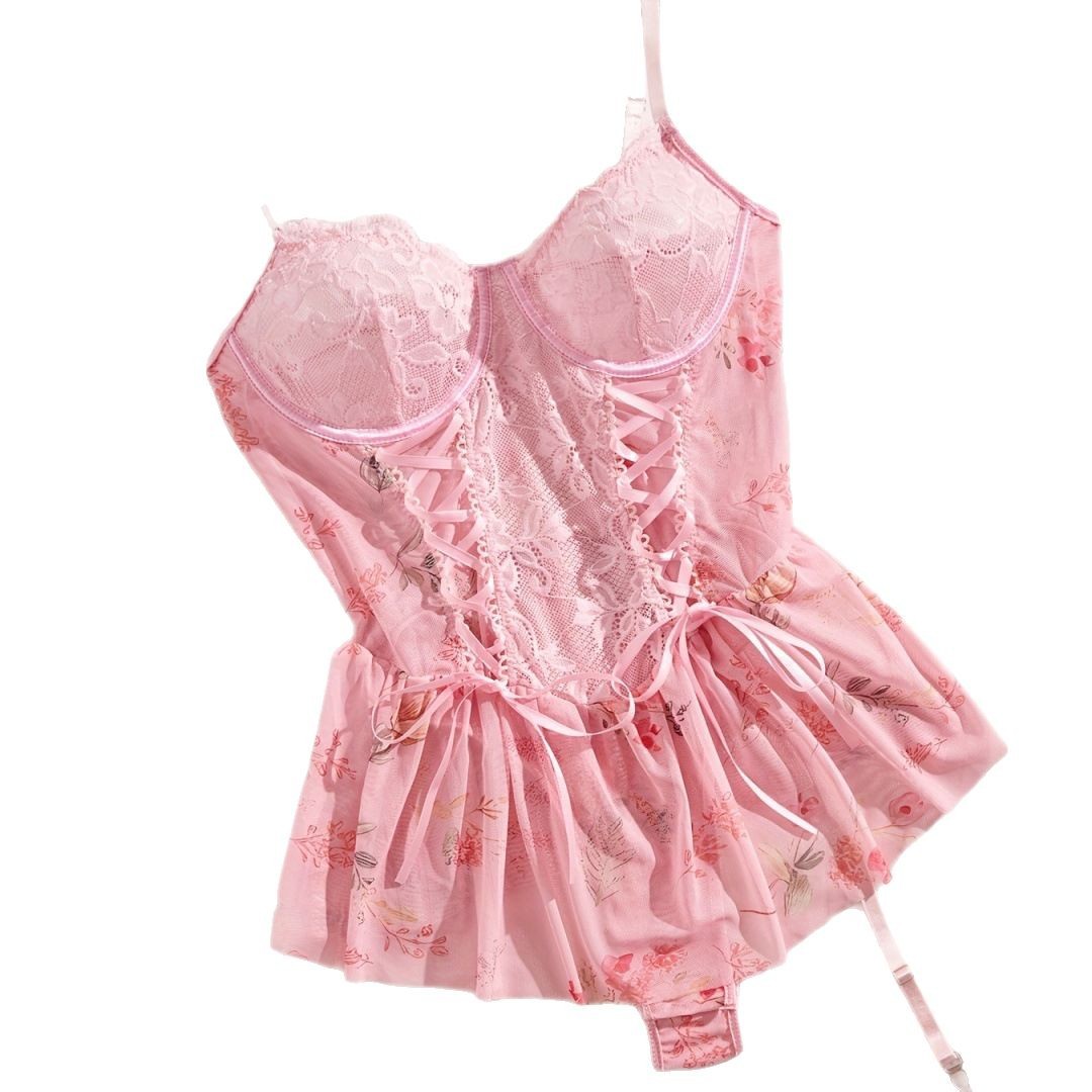 7150 甜美日系性感印花睡裙蕾丝网纱透视诱惑纯欲丁字裤两件套装
