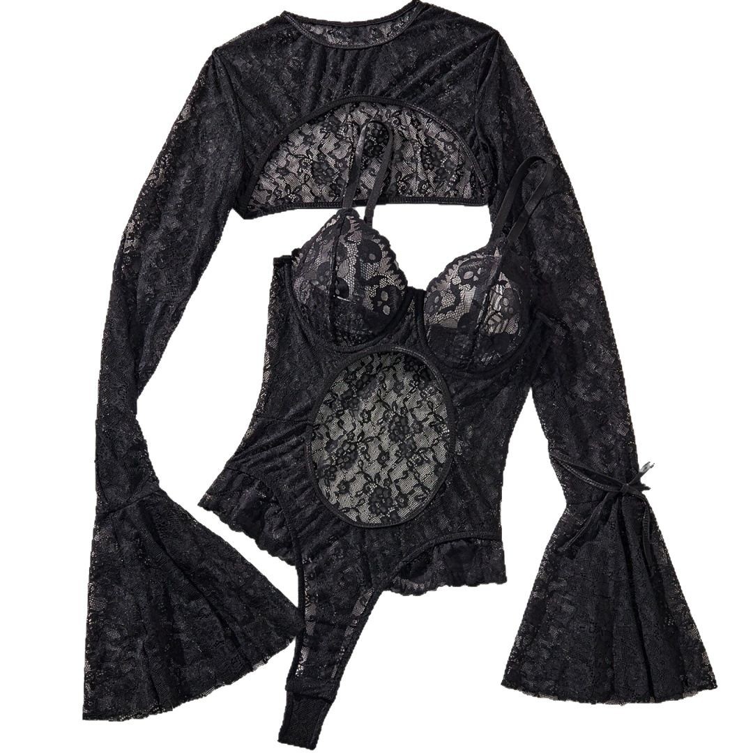 7120爆款辣妹性感蕾丝吊带收腰显瘦暗黑透视长袖连体情趣套装气质