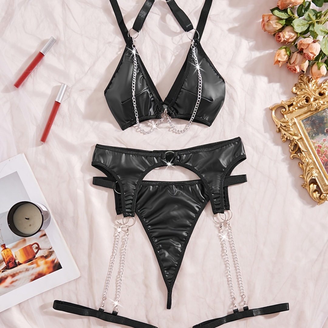 7135 外贸货源欧美新款性感金属链环扣漆皮火辣挂脖情趣内衣套装