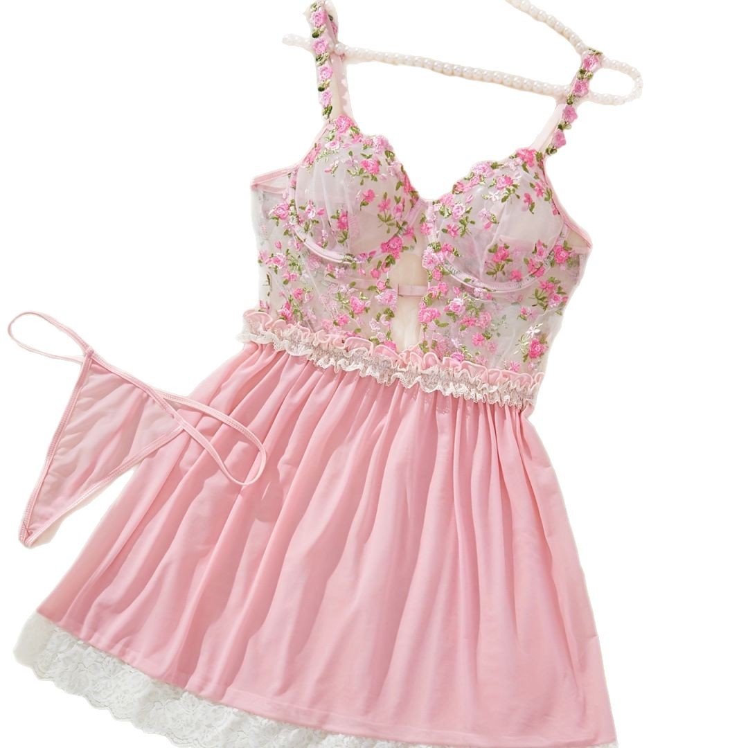 7069 厂家直销 日系甜美网纱拼接小碎花刺绣蕾丝短裙情趣内衣套装