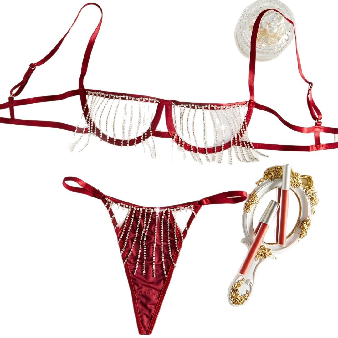7025 跨境外贸热销款 欧美重工钻链酒红色性感透视情趣内衣套装