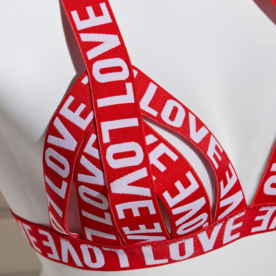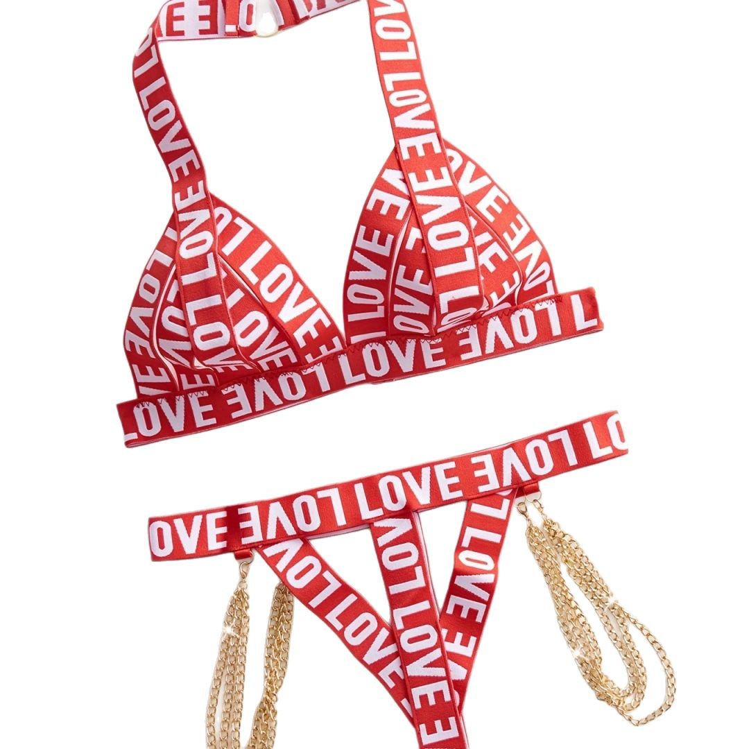 7024 欧美跨境热卖款字母印花LOVE织带重工金属链条情趣内衣套装