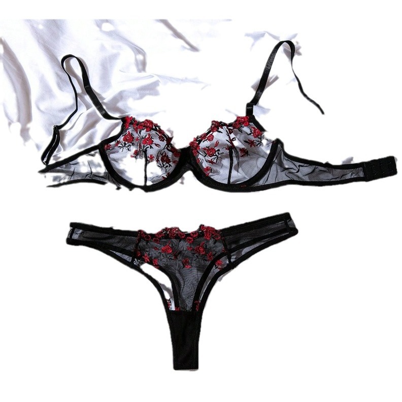 7055 精致小碎花刺绣带钢圈性感网纱透视蝴蝶结情趣内衣文胸套装