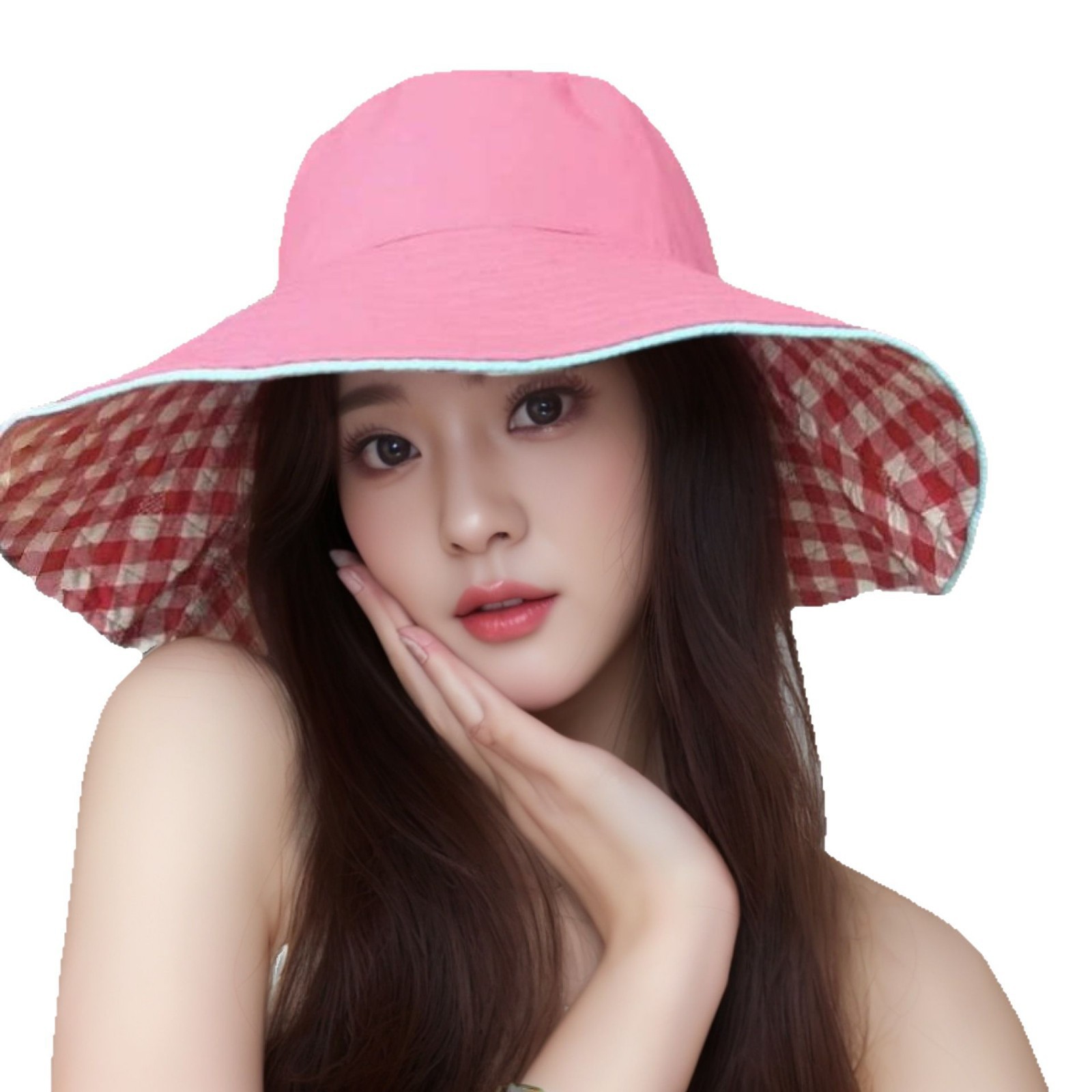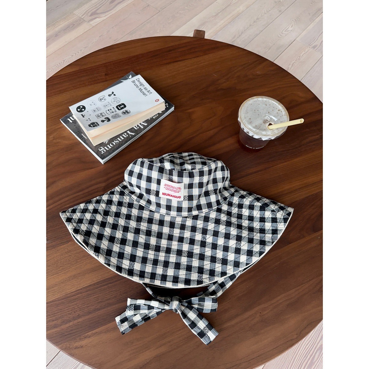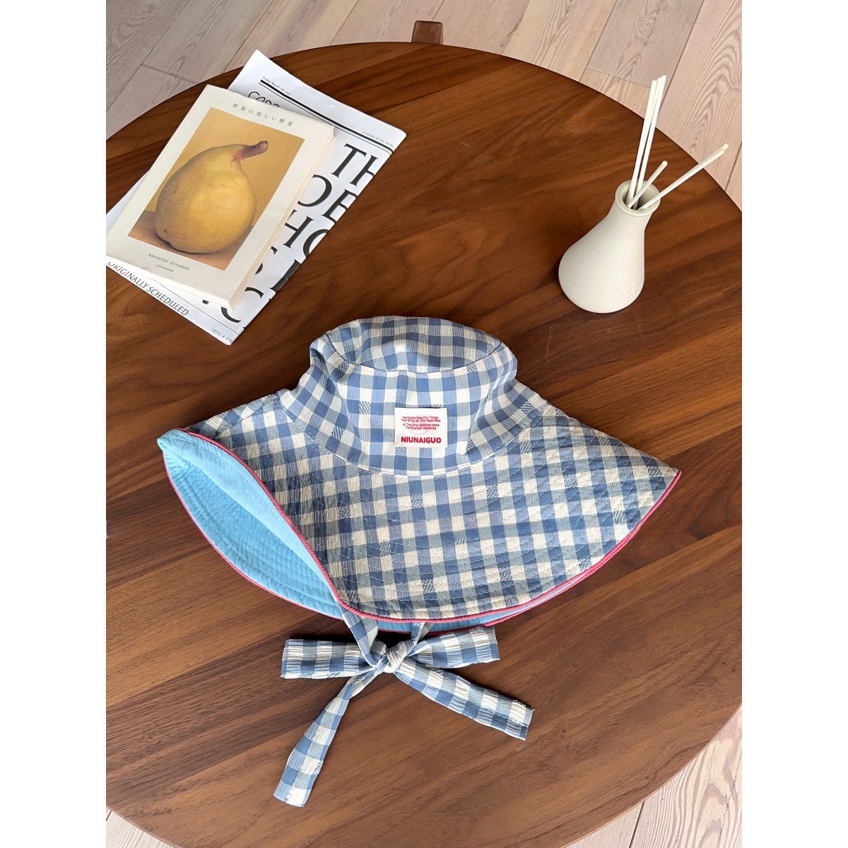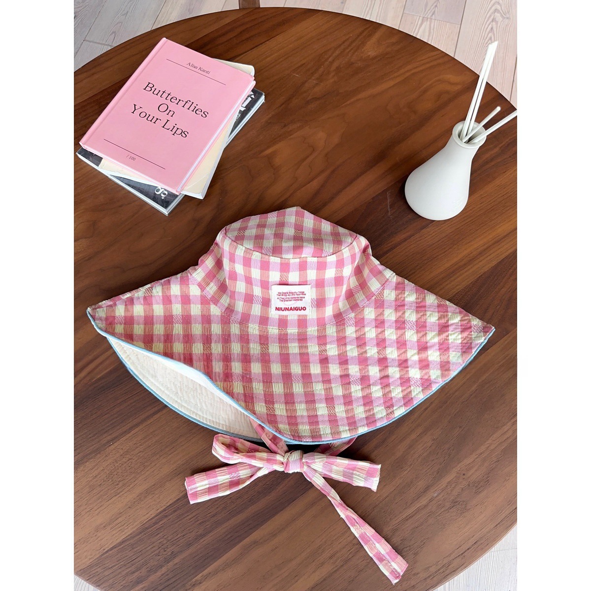 韩版格纹绑带渔夫帽女夏季大檐显脸小防晒遮阳帽子大头双面盆帽